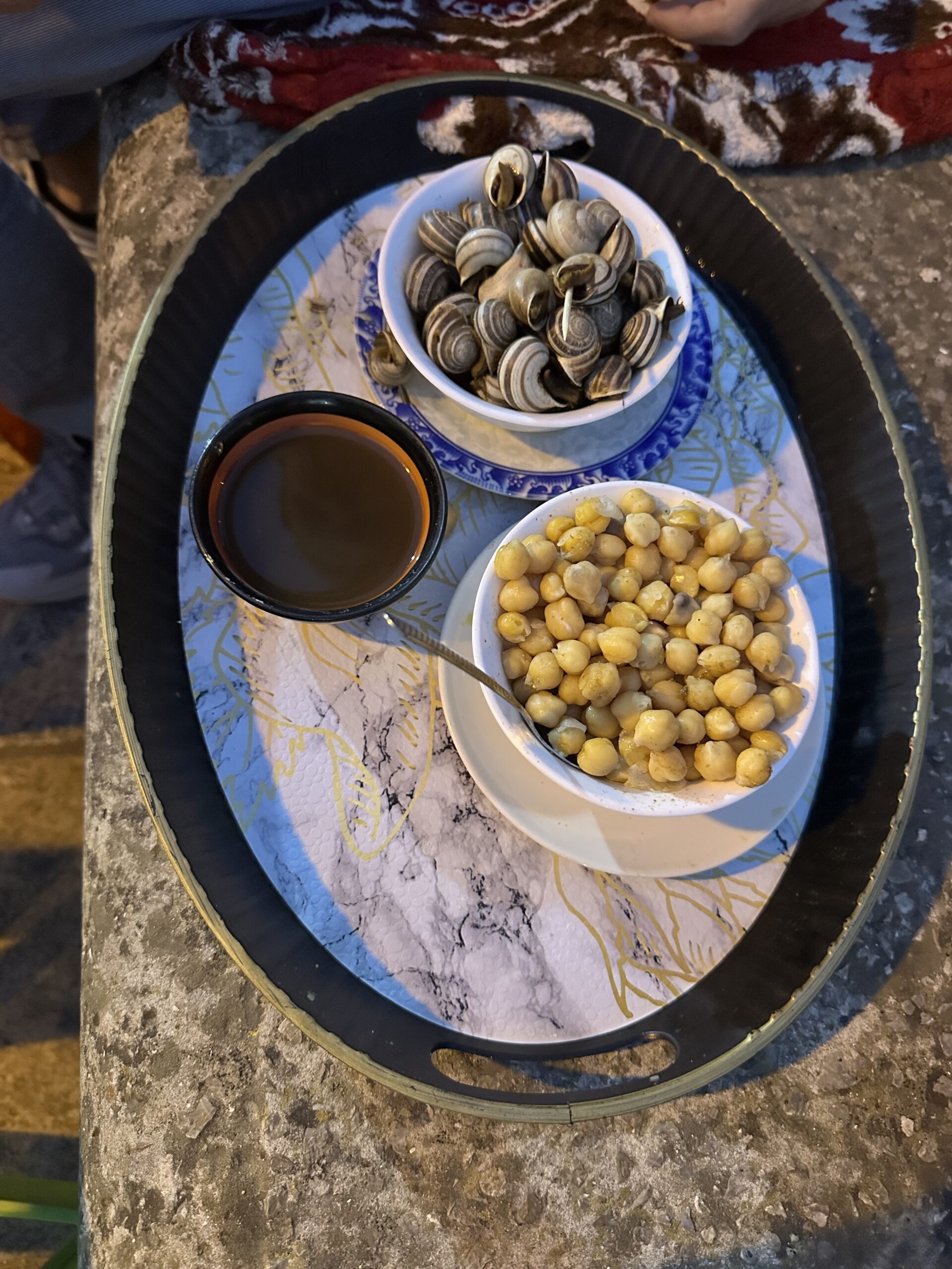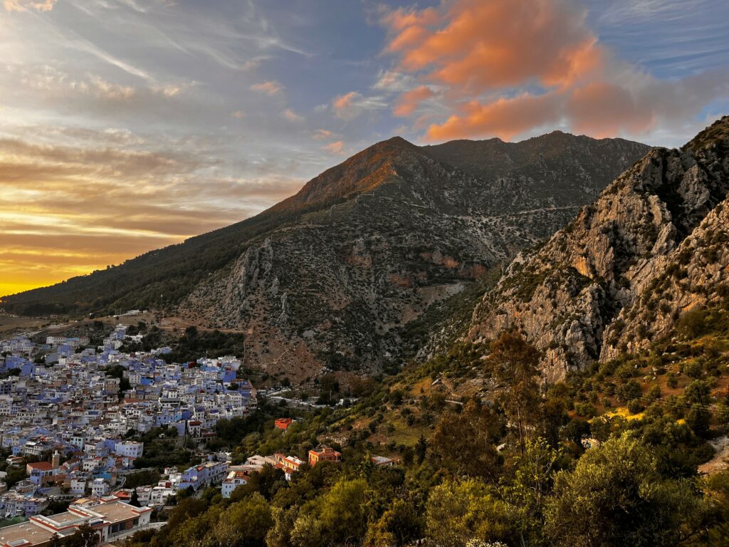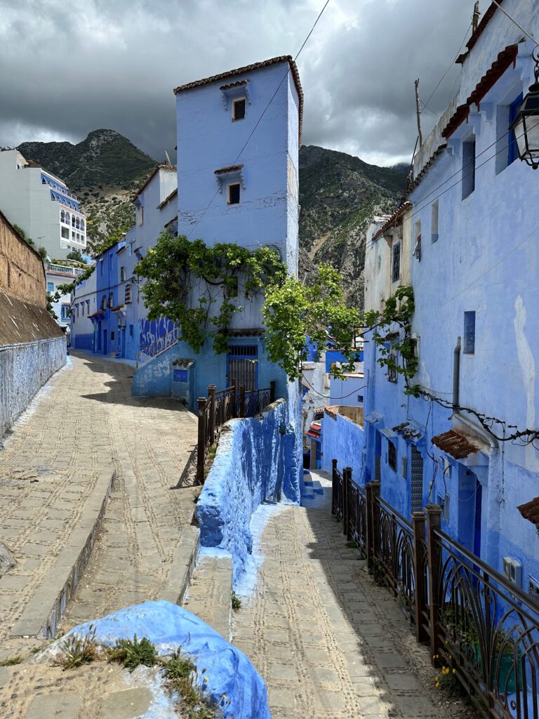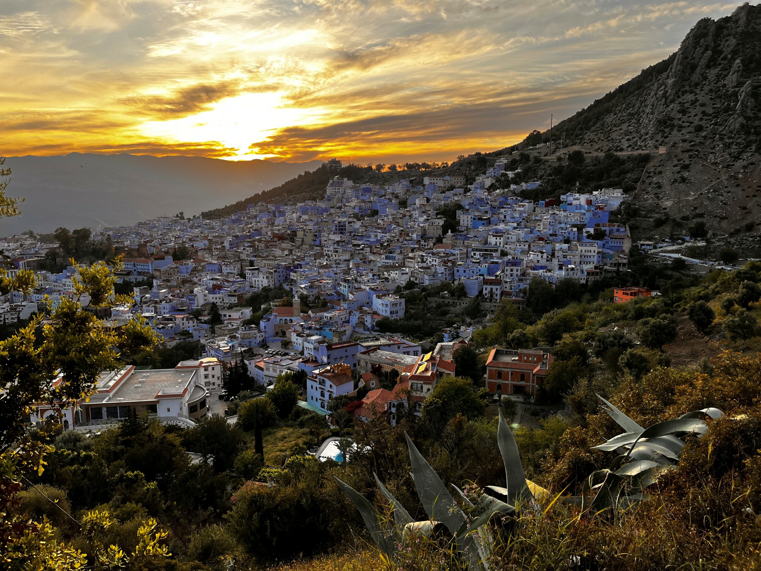 Chefchaouen ist schön und blau – sehr instagrammable, was man hier leider am Klientel merkt. Doch touristische Orte haben auch immer Vorteile: Es gibt hier viele schöne und günstige Unterkünfte – man muss nur ein bisschen suchen. Beim Street Food sieht es hier allerdings anders aus. Einmal abends esse ich ein Eiersandwich, mit mir bis heute unbekannten Zutaten. Außerdem gibt es jede Menge günstige Snackbuden, die Fast Food anbieten. Der Ort liegt oben im Rif-Gebirge; ein Nationalpark schließt sich direkt an. Wir wollen eine sechsstündige Wanderung unternehmen, verlaufen uns jedoch böse und müssen ein Stück den Hang hinunterklettern, bis wir wieder auf den Weg finden. Das kostet uns so viel Zeit, dass wir am Ende die kürzere Version der Wanderung machen – trotzdem ist die Aussicht auf die Stadt toll, besonders abends bei Sonnenuntergang. Insgesamt haben wir hier nicht allzu viel zu tun: Wir genießen den schönen Garten in der Unterkunft unseres Hosts Mohammed Ali (ja, wirklich), telefonieren mit Zuhause, arbeiten ein bisschen am Blog und buchen die weitere Reise bis zum Workaway in Portugal.