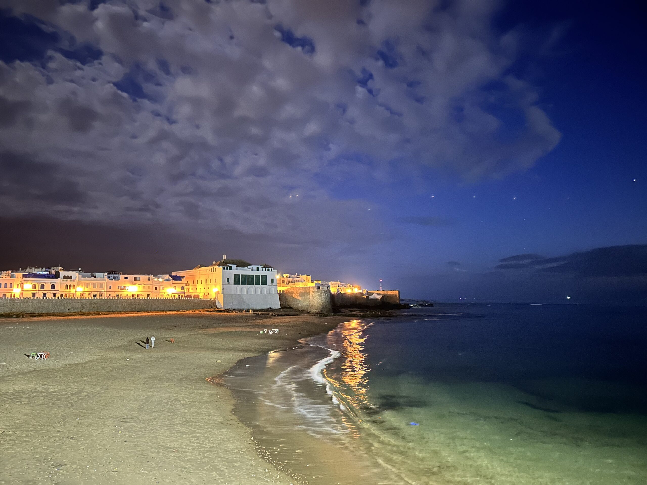 Vom Hafen aus geht unsere Fähre zurück nach Algeciras, weshalb wir die Gelegenheit noch einmal nutzen wollen, um die Stadt zumindest einen Tag lang auszuchecken. Die Neustadt einschließlich des Hafens ist super modern und wie geleckt – unter anderem wohl wegen der für 2030 geplanten WM in Marokko. Auch der Stadtstrand ist sauber; hier wird Kamel- und Pferdereiten angeboten. Wir lassen uns per Taxi zur Moschee am Hafen fahren und unser Taxifahrer ist ganz erstaunt, dass wir nach dem Preis fragen, in Tanger gibt´s schließlich Taxameter – über diese Aussage sind wir wiederum überrascht. Marokko bleibt ein Rätsel. Wir erkunden die Medina „self-guided“ – auch diese ist schön rausgeputzt, relativ übersichtlich und in Weiß gehalten. Leider habe ich unterwegs unsere wenigen Einkäufe verlegt, weshalb wir sie jetzt noch einmal kaufen müssen – wir kennen also die Preise und verhandeln den Preis auf ein Fünftel der ursprünglichen Anfrage des Händlers. Scheinbar sind wir jetzt erst ready für Marokko. Abends gönnen wir uns nochmal etwas für dieses Land eher ungewöhnliches: Wir gehen ins Kino (Film: „Thank You for Banking with Us“– arabisch mit englischem Untertitel).
