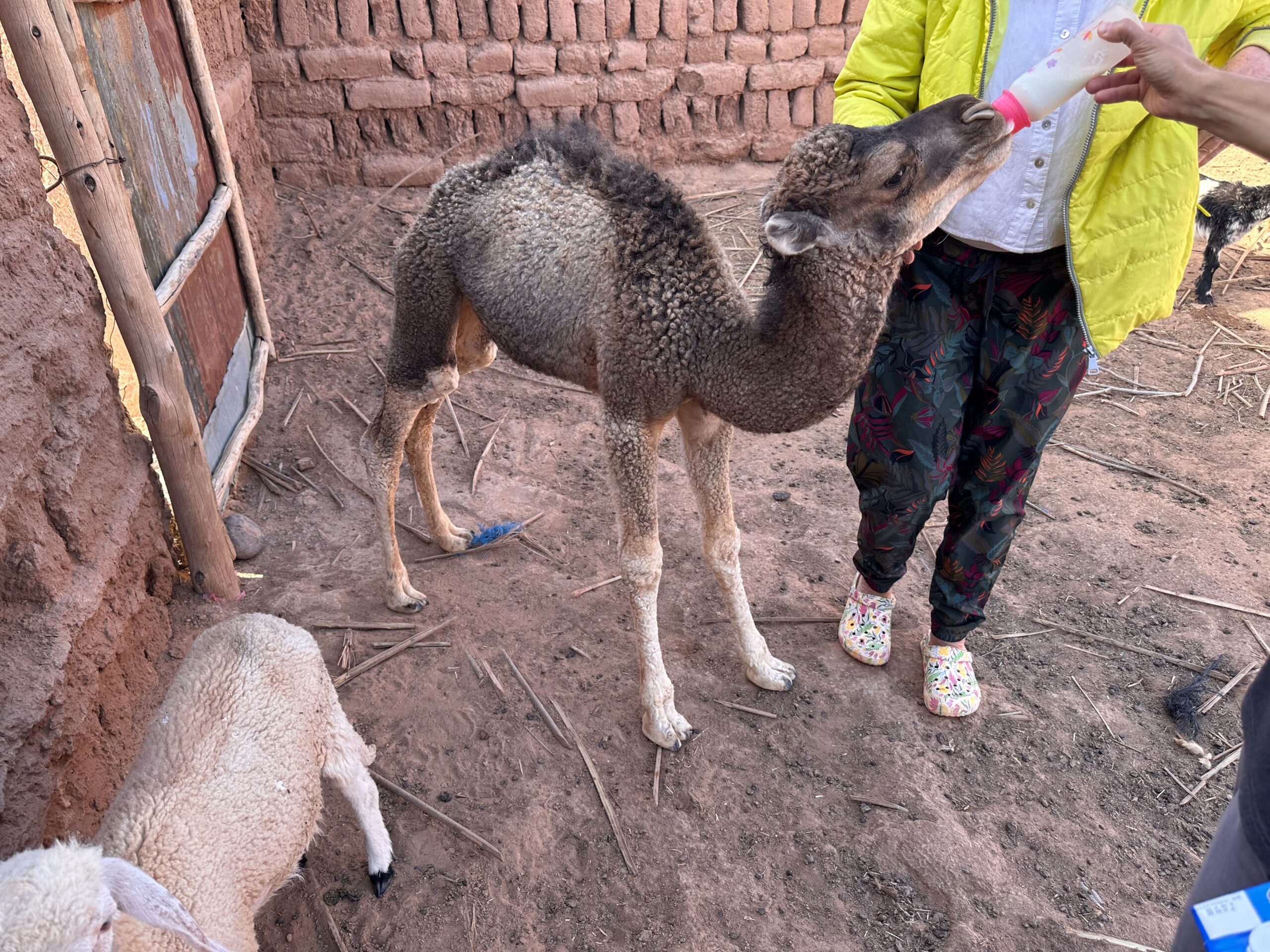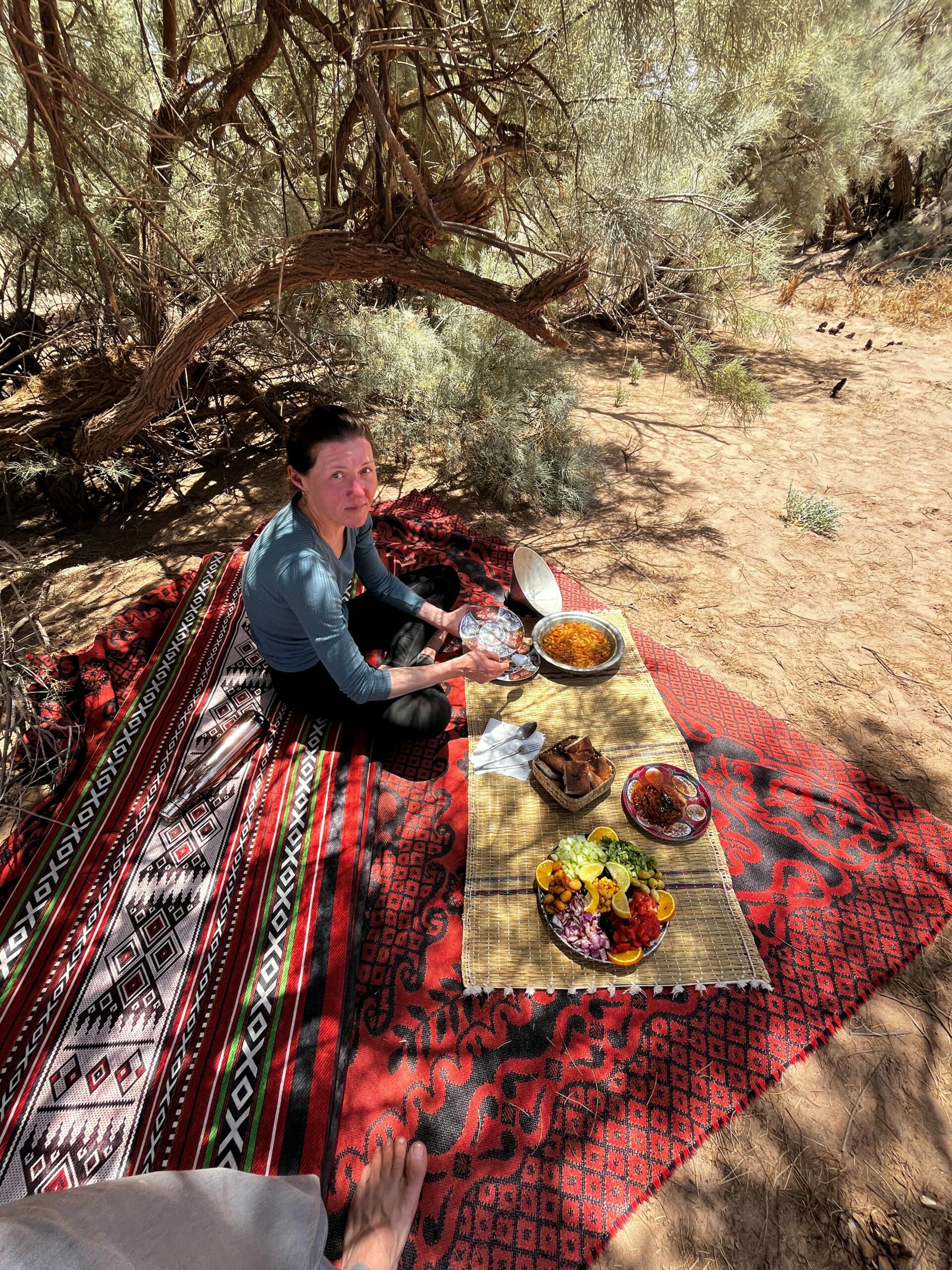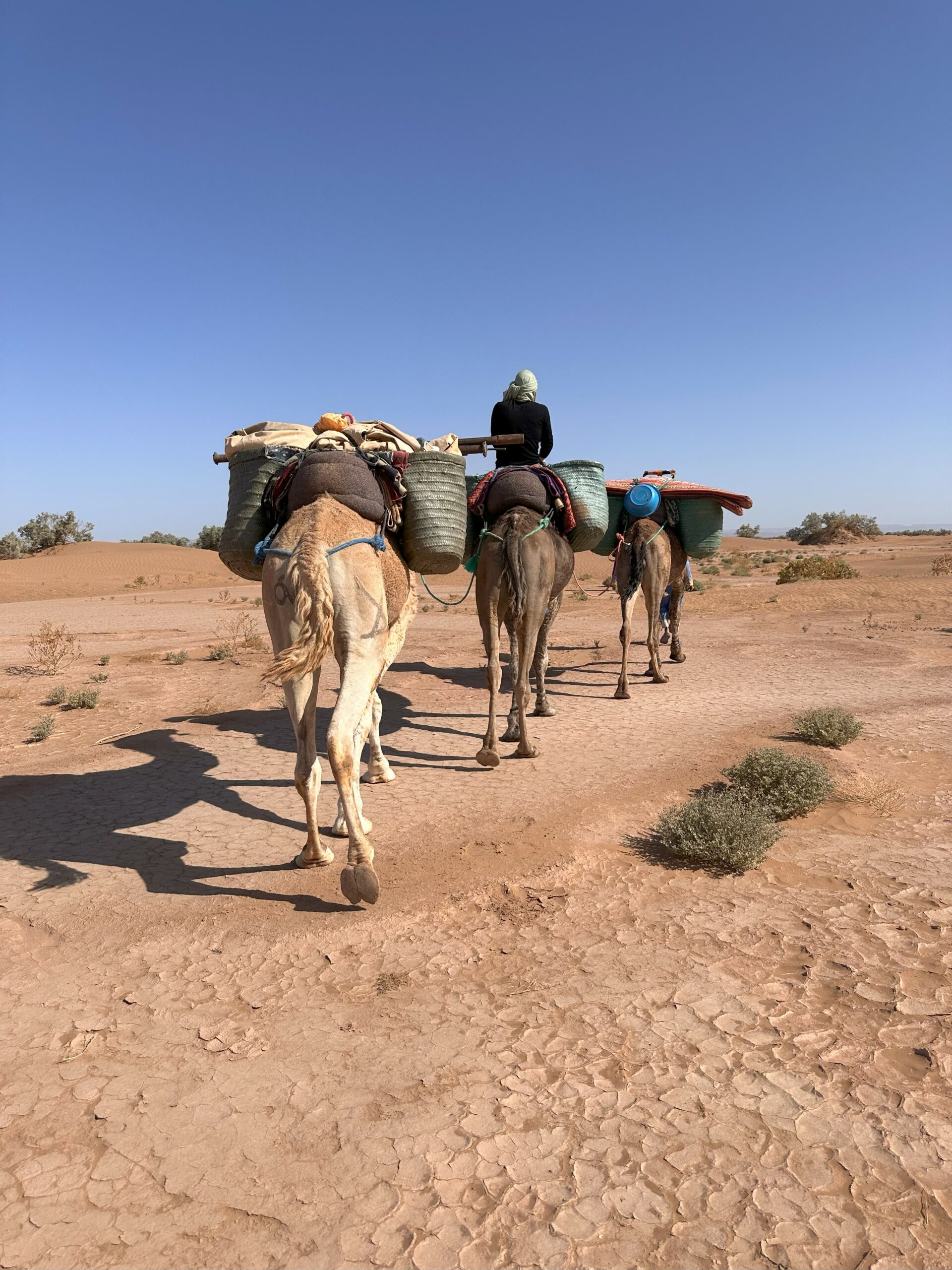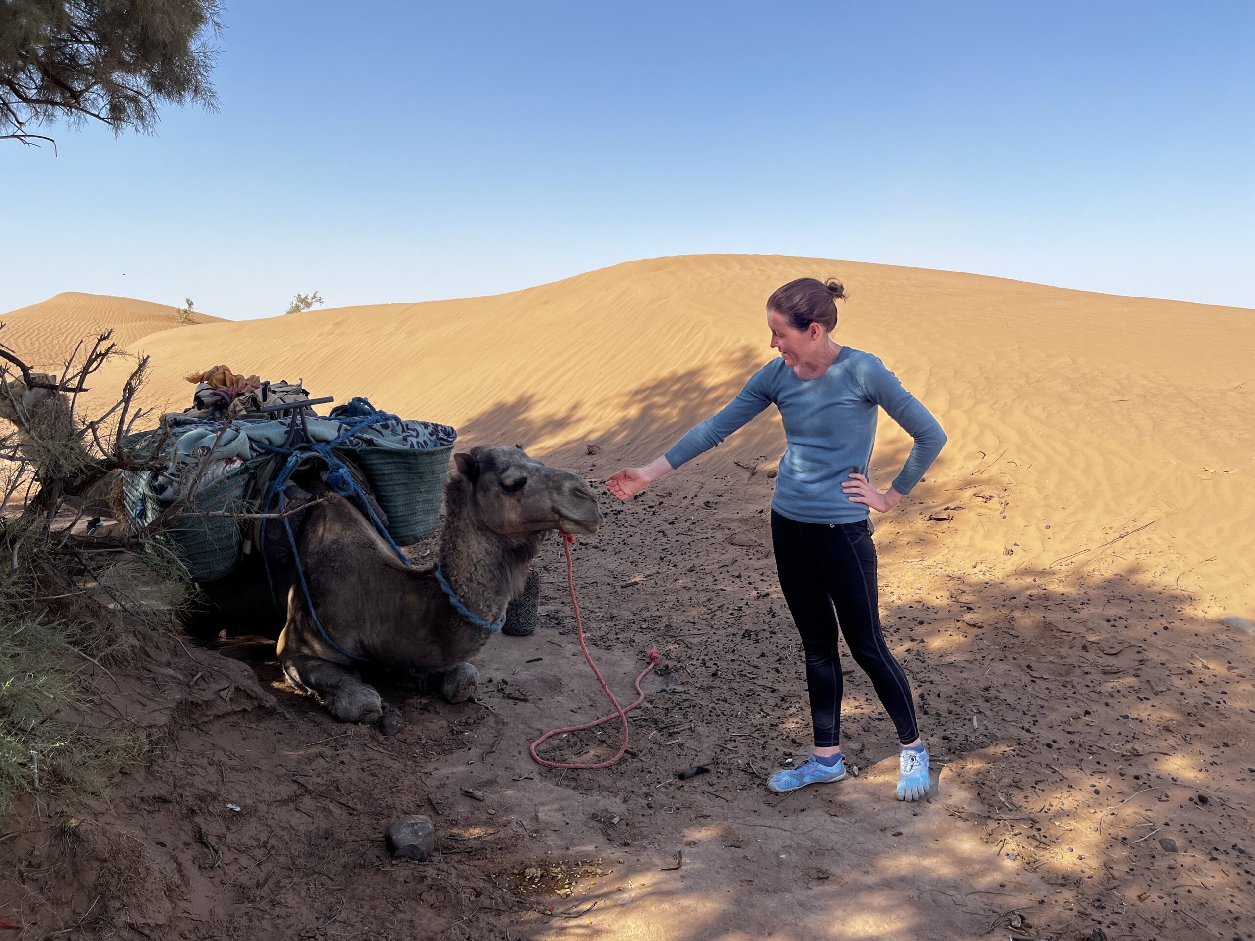 Am nächsten Morgen dürfen wir nach einem brotlastigen Frühstück ein Babykamel sehen und ihm sogar ein Fläschchen geben. Und dann ziehen wir los: Unser Guide Hyssein, sein junger Kollege Habib, drei Kamele und wir beiden Kamele. Wir laufen über trockenen Sandboden, umgeben von erstaunlich viel Grün. Wir freuen uns über die Kamele, die stoisch Habib folgen und dabei immer wieder mal einen ganzen Busch rausreißen und fressen. Wir passieren Dünen, Kies und andere trockene Landschaften. Die Sonne brät auf uns ein, aber es gibt einen angenehmen Rückenwind. Nach ungefähr vier Stunden machen wir unter einem großen Baum Rast. Die Kamele knien sich widerstrebend hin und werden entladen. Ich bin überrascht, wie ungelenk diese Bewegung ist – man möchte ihnen sagen, sie sollen sich nicht so hinplumpsen lassen, das ist nicht gut für die Gelenke! Danach werden sie freigelassen, sie trotten ein paar Meter davon – und fressen. In der Zwischenzeit bekommen wir einen Tee und Snacks serviert und danach ein reichhaltiges Mittagessen aus Salat, Fisch und Omelette. Es hätte so idyllisch sein können hier – wären da nicht diese nervtötenden Fliegen. Gegen Nachmittag, als wir – nach einer fünfstündigen Pause wegen der Hitze – weiterziehen, fegt eine kleine Windhose über eine Düne, das Licht ändert sich langsam, der Sand erscheint rötlicher.
