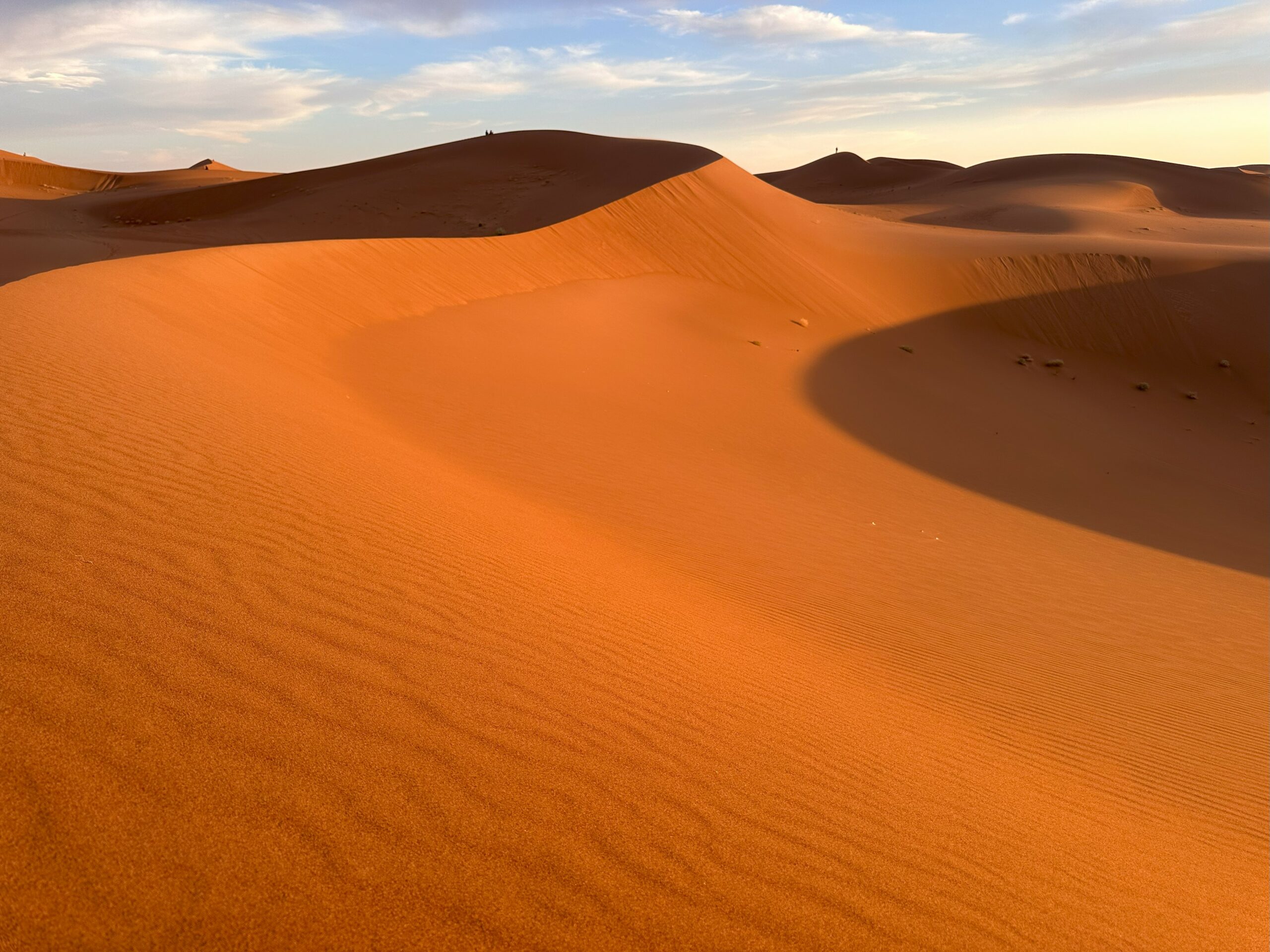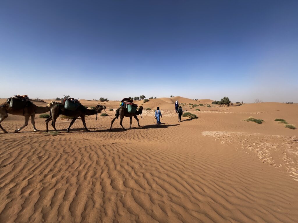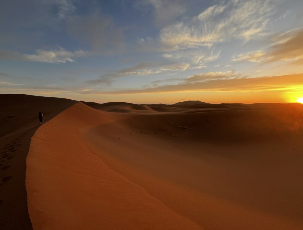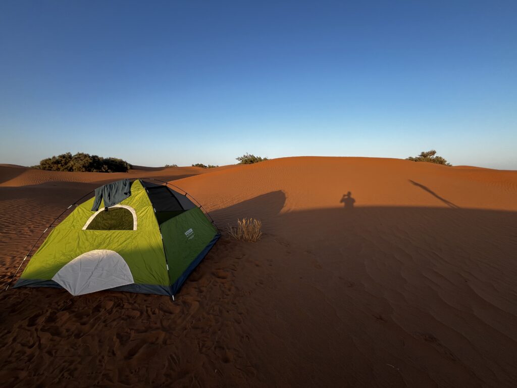Nach weiteren 1,5 Stunden kommen wir in einer spektakulären Dünenlandschaft an, wo unser Lager aufgebaut wird. Wir „helfen“ ein bisschen beim Abladen und Aufbauen und machen uns dann auf, um die Dünen zu erkunden. Die Sonne steht nun ziemlich tief, das Licht ist fantastisch. Die Wellen im Sand werfen kleine Schatten. Der Sand ist vollkommen unberührt. Auch die Akustik ist faszinierend, wir stehen uns auf zwei Dünen gegenüber, können uns aber in Zimmerlautstärke unterhalten. Wir bestaunen den Sonnenuntergang und machen viel zu viele Bilder. Danach geht’s zurück in unser Nachtlager, wo wieder Tee und später – natürlich – eine Tajine auf uns wartet.