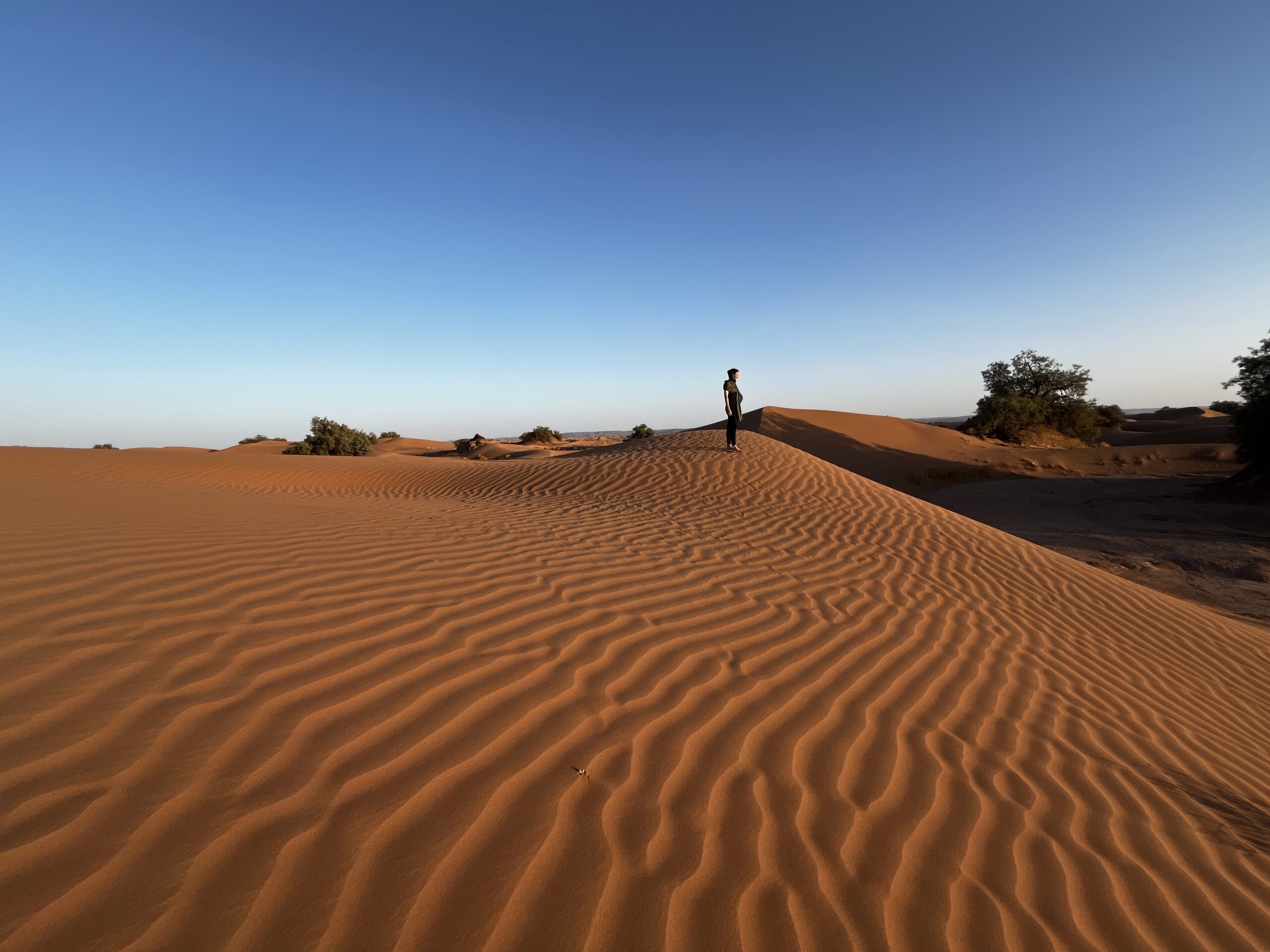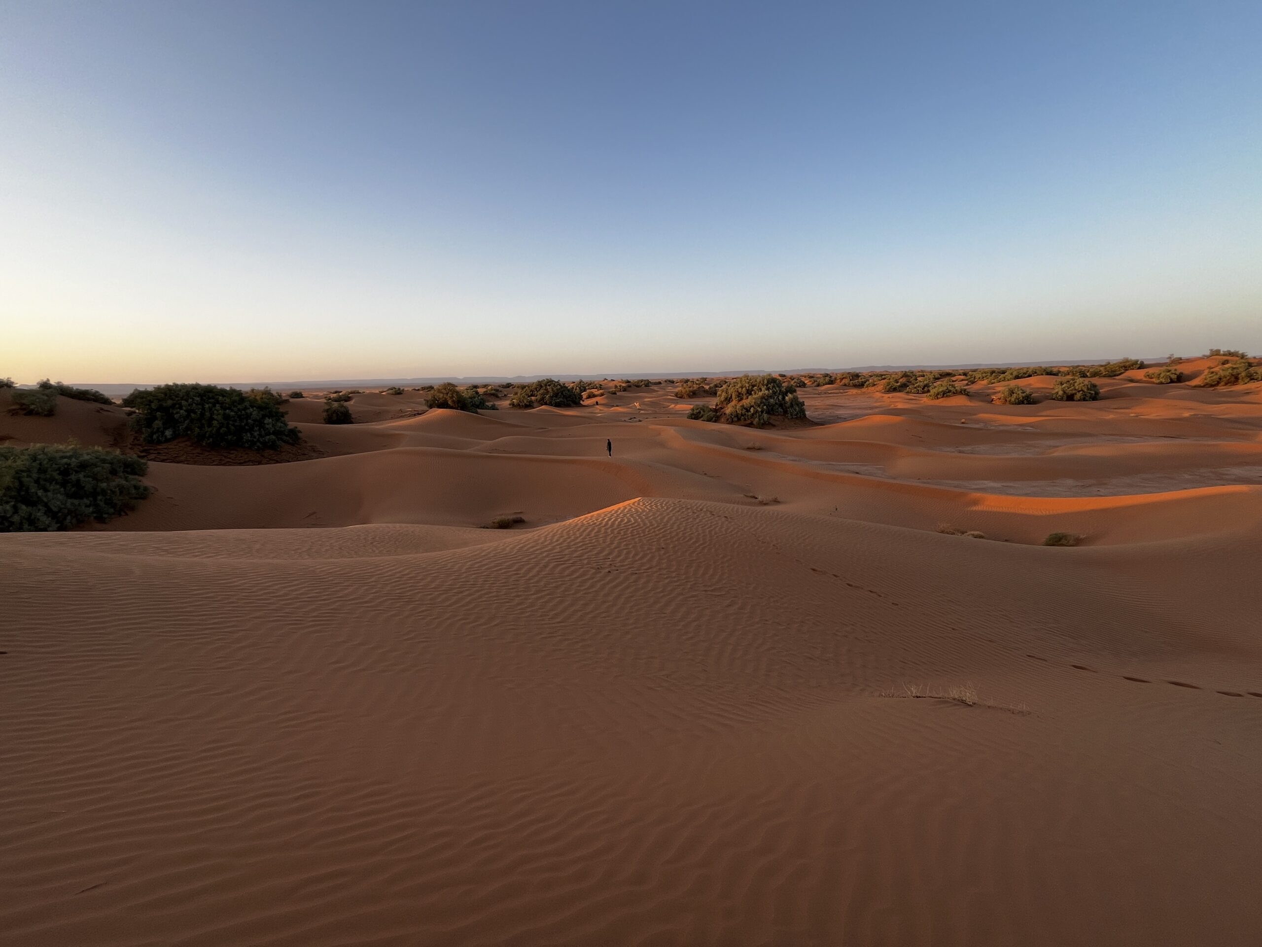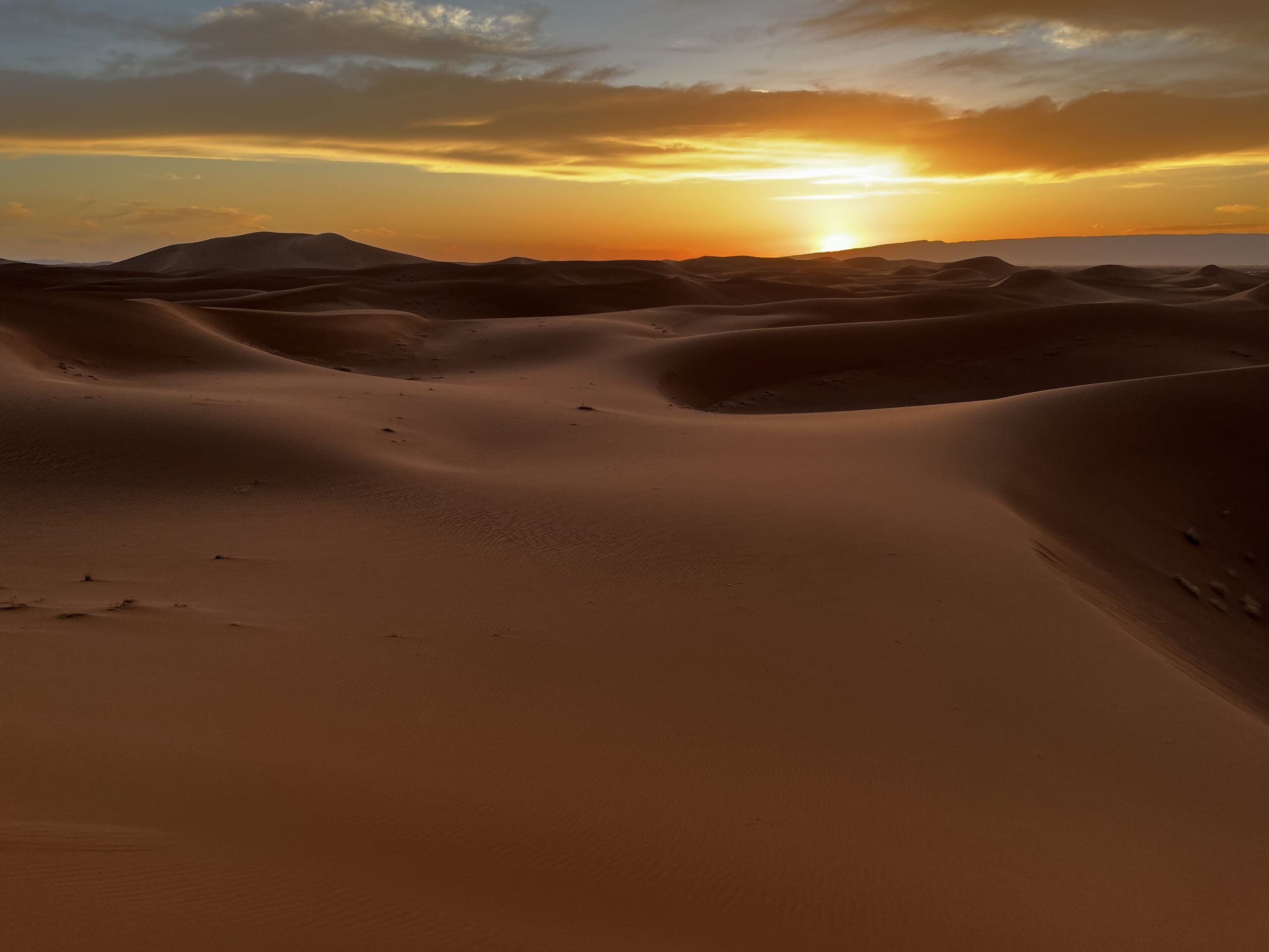 Nach weiteren 1,5 Stunden kommen wir in einer spektakulären Dünenlandschaft an, wo unser Lager aufgebaut wird. Wir „helfen“ ein bisschen beim Abladen und Aufbauen und machen uns dann auf, um die Dünen zu erkunden. Die Sonne steht nun ziemlich tief, das Licht ist fantastisch. Die Wellen im Sand werfen kleine Schatten. Der Sand ist vollkommen unberührt. Auch die Akustik ist faszinierend, wir stehen uns auf zwei Dünen gegenüber, können uns aber in Zimmerlautstärke unterhalten. Wir bestaunen den Sonnenuntergang und machen viel zu viele Bilder. Danach geht’s zurück in unser Nachtlager, wo wieder Tee und später – natürlich – eine Tajine auf uns wartet.