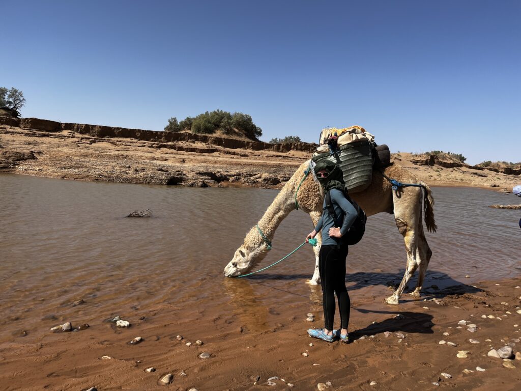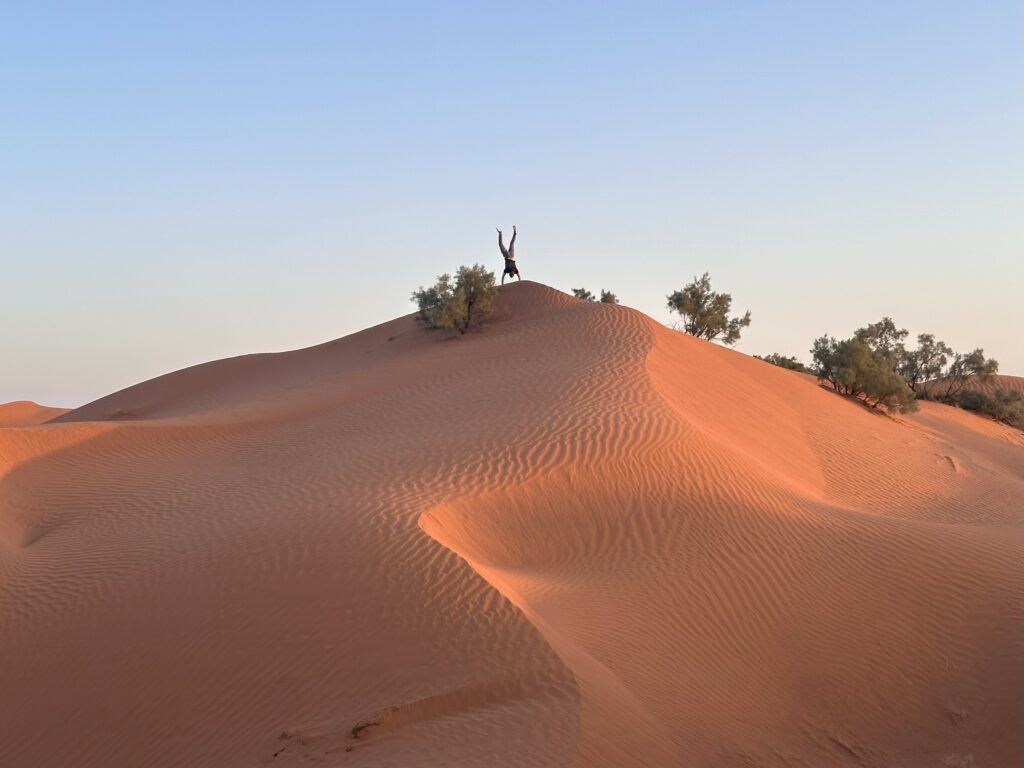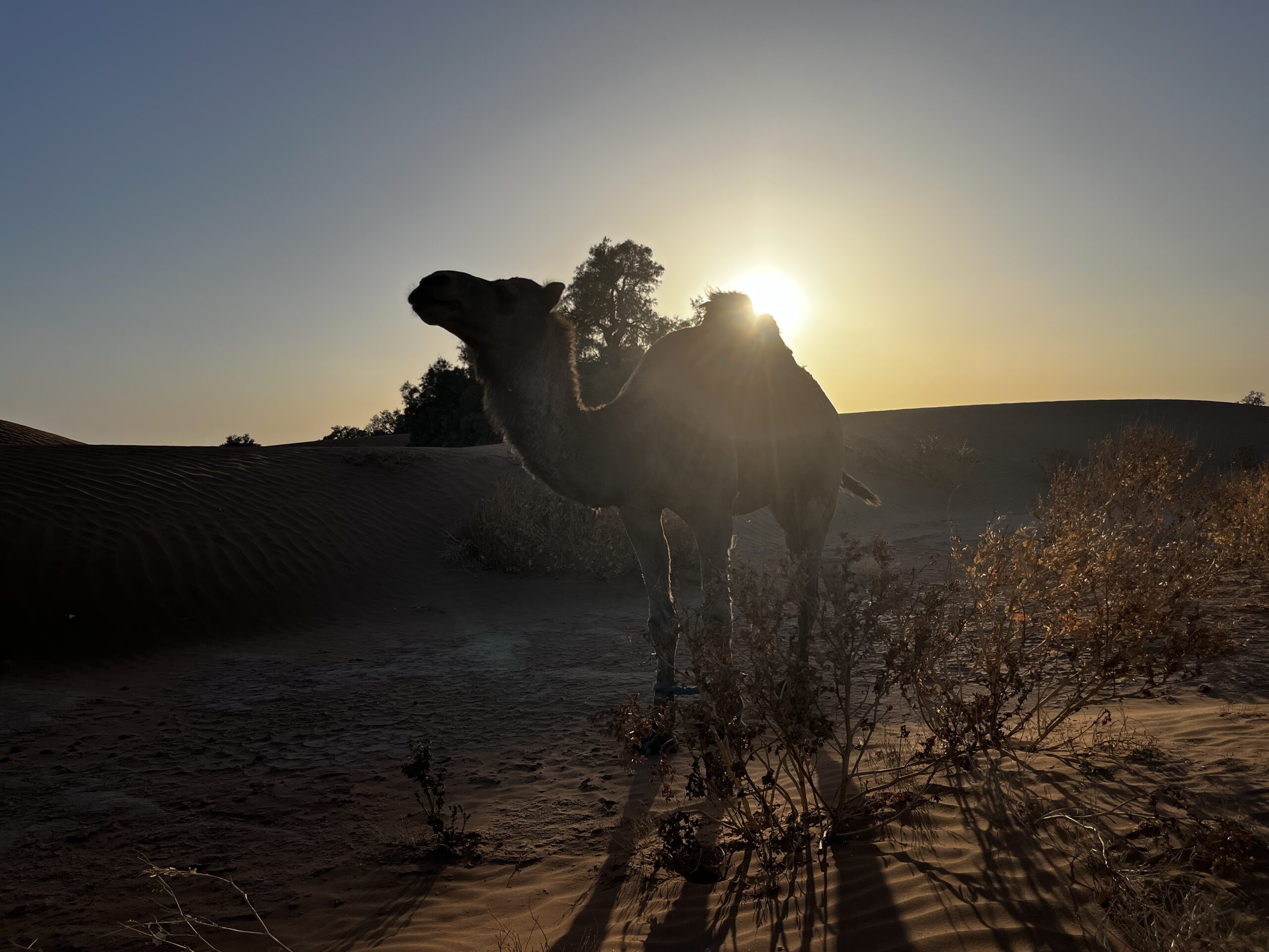 Wir passieren eine Wasserlache, ich steige ab und die Kamele dürfen ihre Höcker auffüllen. Klara führt „ihr“ Kamel selbst zum Wasser, und sobald der Durst (vom Kamel) gestillt ist, reiten sie weiter. Auch heute machen wir eine ausgedehnte Mittagspause mit köstlichem Mittagessen. Es ist windstill und die Temperaturen steigen auf knapp 40°C, zwischenzeitlich ist es schwer zu ertragen. Gegen Abend ziehen wir weiter und stoppen an einer noch spektakuläreren Dünenlandschaft als am Tag zuvor. Um nachts nicht wieder frieren zu müssen, bauen wir uns heute ein kleines Zelt als Nachtlager auf. Wir toben uns auf den Dünen aus und beobachten wieder einen unglaublichen Sonnenuntergang.