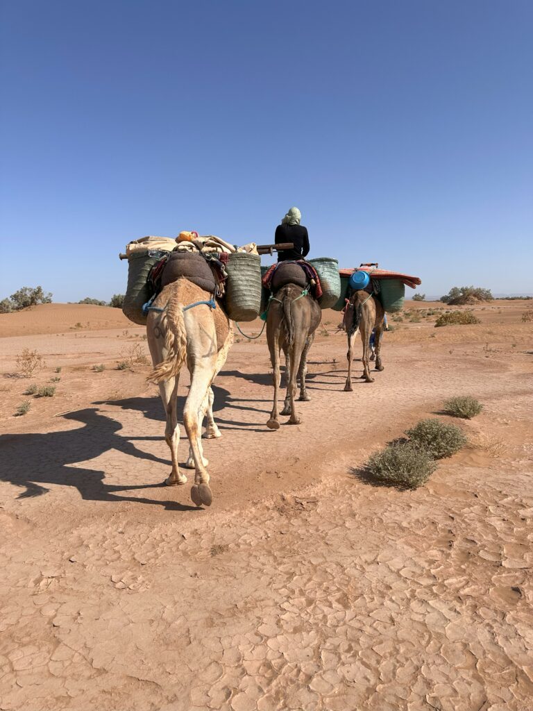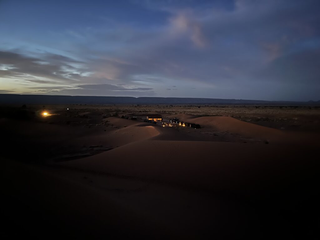 Wir reisen spät in den Wüstenort M’Hamid – ein Ort, der hauptsächlich deshalb besteht, weil er als eines der Tore zur Sahara dient – und werden in einem 4×4-Van für nur einige Minuten in die Wüste zu unserem Camp gebracht. Dieses besteht aus verschiedenen Lehmhütten, die entweder als Zimmer, als Bad oder als Gemeinschaftsraum dienen. Gegen 23 Uhr kriegen wir noch das bisher späteste Abendessen unter freiem Himmel serviert – natürlich eine Tajine (Wikipedia) – und gehen mit unzähligen Insekten ins Bad und verbringen dann unsere erste Nacht in der Sahara.