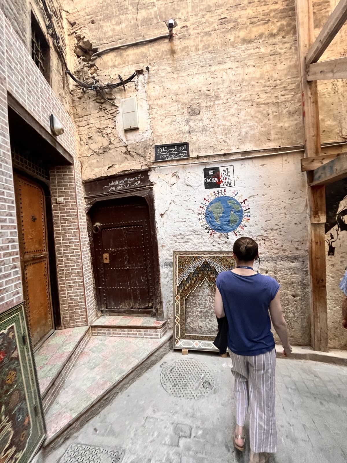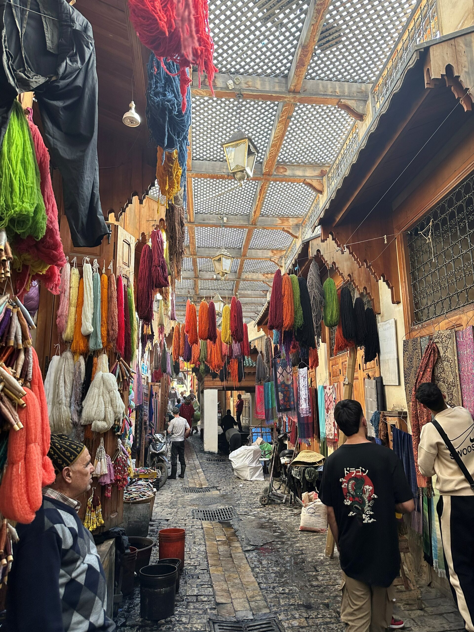 Die Medina besteht aus alten, sehr verwinkelten Gassen, in denen die Händler allerlei handgefertigte Waren anbieten. Viele der Viertel sind hierbei nach Thema geordnet, so gibt es zum Beispiel ein Färber- und ein Gerbereiviertel; Holz und Metall haben auch ihre eigenen Bereiche. Ein bisschen wie bei der IG Metall und Verdi, nur sicherlich ohne Gewerkschaft, sehr wahrscheinlich ohne Arbeitsvertrag und möglicherweise auch ohne Steuerbeleg. Am Ende fallen wir leider dann doch noch auf einen “Faux Guide” herein, der einem seine Hilfe anbietet und danach lautstark dafür Geld verlangt. Wir kommen hier mit ein paar Dirham und etwas Diskussion davon, lernen aber eine wichtige Lektion: Es ist in Marokko schwer, für uns die Leute richtig einzuschätzen. Das führt dazu, dass man ehrlich angebotene Hilfe ablehnt oder dass man den falschen Leuten vertraut. Dieses Spiel wird uns leider immer wieder begegnen – es ist wie so oft: Einige wenige ruinieren das Bild, während sich viele andere gut verhalten.