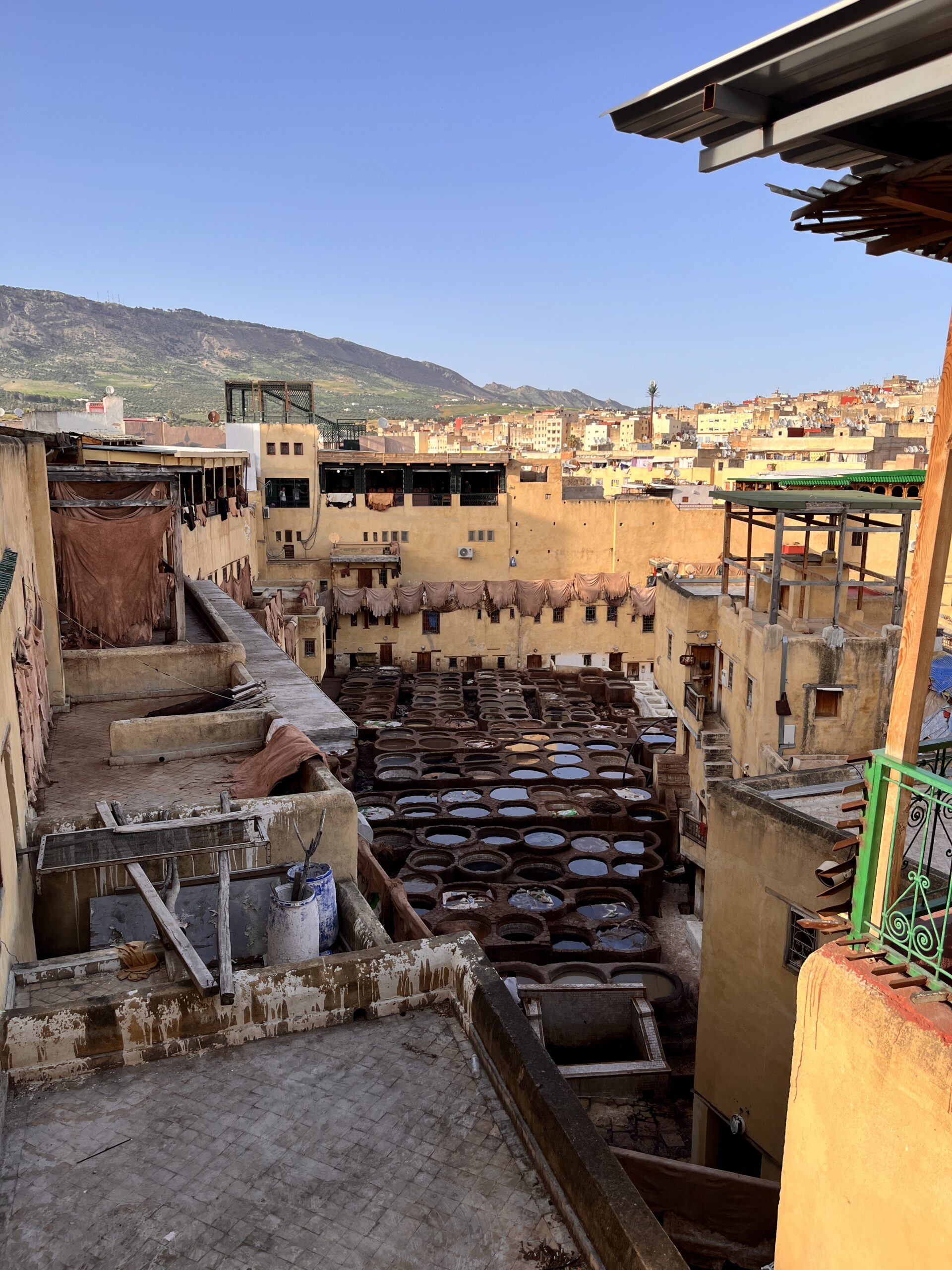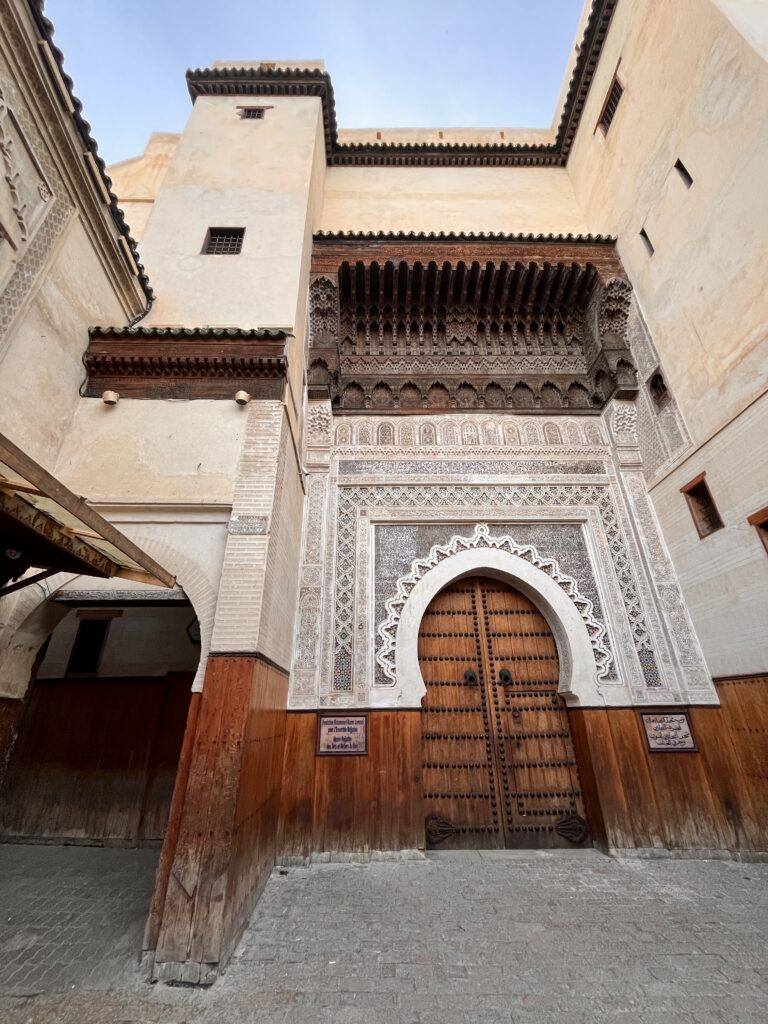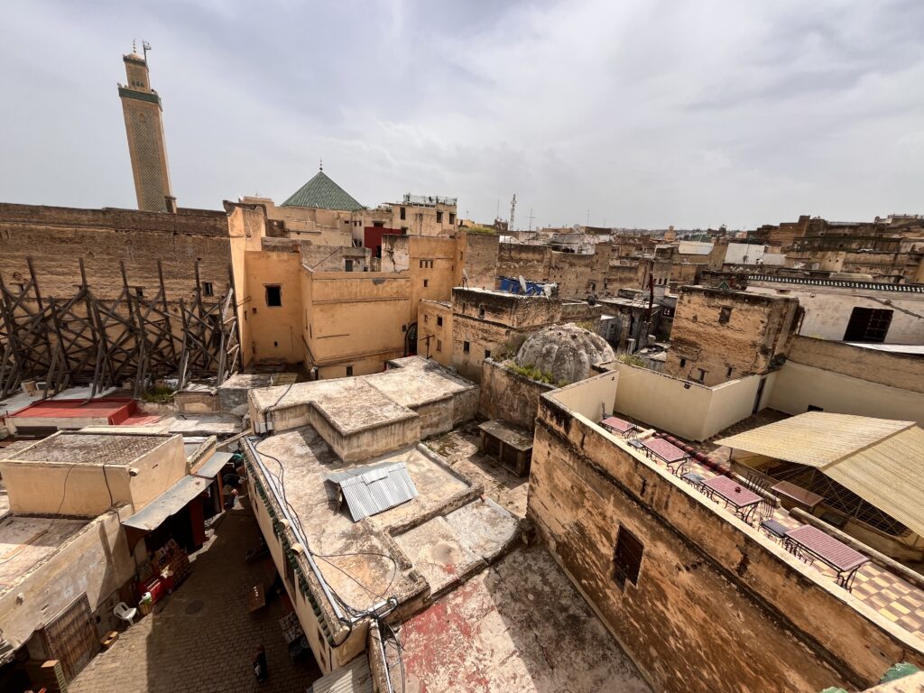 Die Stadt hat uns überrumpelt, und das auf mehrere Arten. Wir hatten einen schwierigen Start hier, als wir mit einem (wie jetzt im Nachhinein klar ist) zu teuren Taxi in die Medina gefahren sind. Da leider sowohl die Fähre als auch der Bus von der Fähre deutlich länger gebraucht haben als angegeben, sind wir erst nachts angekommen. Natürlich sind wir sofort in die Falle getappt – nachts, keine Orientierung im Ort, rein in die Medina! Sämtliche Navis waren überfordert, und somit konnten wir nicht anders, als uns helfen zu lassen – was man ja nicht tun soll – und wurden tief in die Gassen gelotet. Zu unserer Erleichterung kamen wir aber auch wieder aus den Gassen heraus und direkt zu unserem Hotel. Das war schon mal ein Lehrstück, wie man es nicht machen sollte. Das Hotel ist ein Dar, also die kleine Version eines Riads (Wikipedia), ohne Garten oder so im Innenhof – es ist cool, echt marokkanisch und hat (wie ich finde) viel mehr Stil als ein normales Hotel. Von unserem Dar aus erkunden wir die nächsten vier Tage Fes, machen eine geführte Tour durch die Medina, besorgen uns eine marokkanische SIM-Karte, gehen nochmal mehrmals alleine los und machen uns langsam mit Marokko vertraut. Wir finden dabei schnell Gefallen an der marokkanischen Gastronomie, gehen regelmäßig in einen “salon de thé” – wo wir meistens die einzigen Touristen sind und vor allem Klara die einzige Frau ist – um einen marokkanischen thé à la menthe oder Kaffee zu genießen, und probieren uns durch die lokale Küche – klassische Gerichte, Streetfood (Was ist das? Ich will es probieren!) oder auch ein Kamelburger, darf’s mal zwischendrin sein.