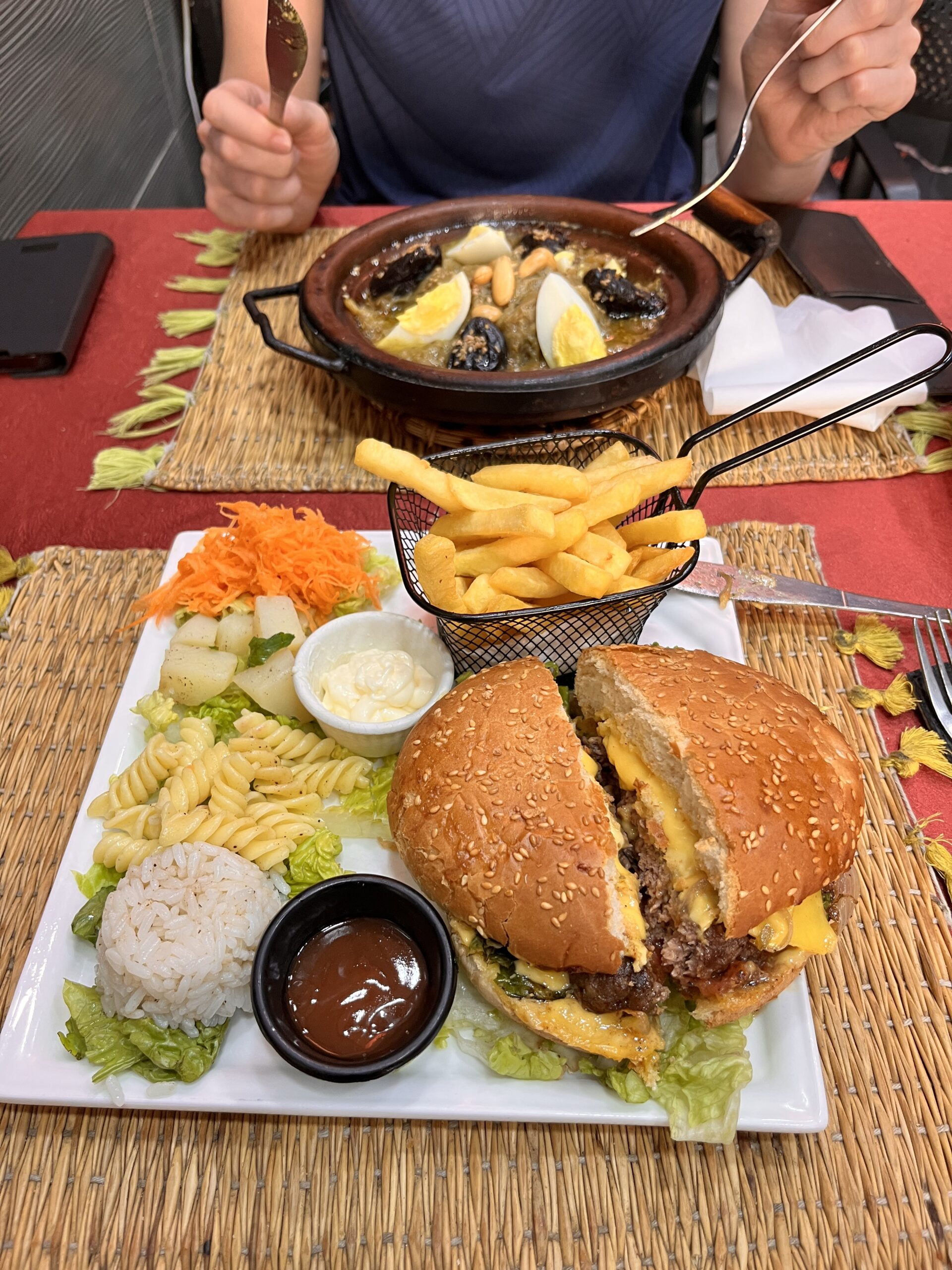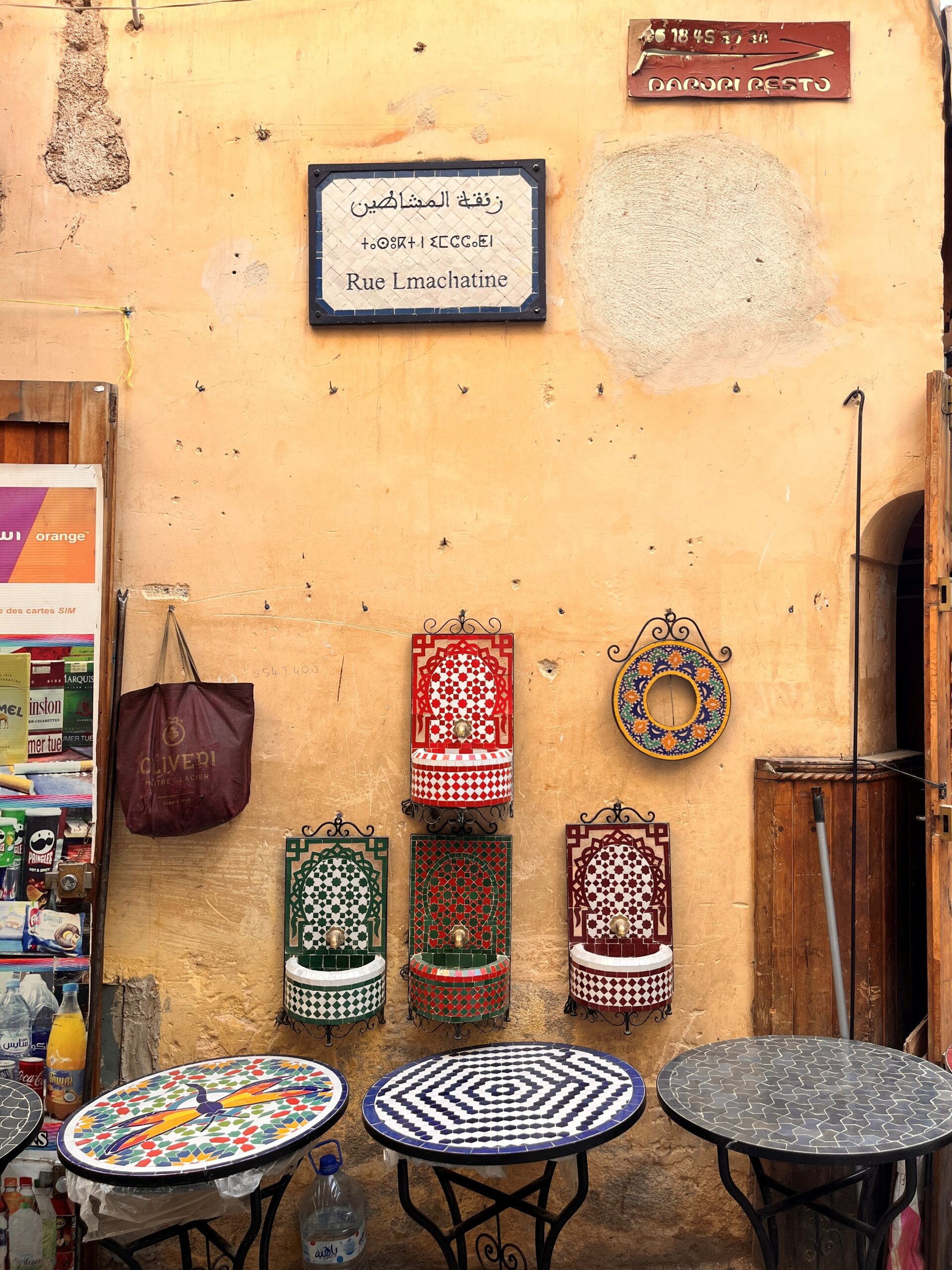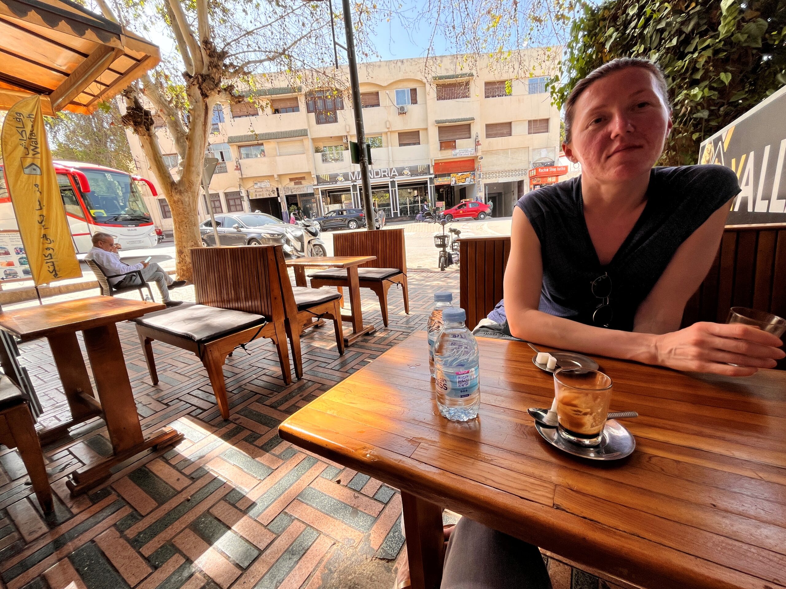 Die Stadt hat uns überrumpelt, und das auf mehrere Arten. Wir hatten einen schwierigen Start hier, als wir mit einem (wie jetzt im Nachhinein klar ist) zu teuren Taxi in die Medina gefahren sind. Da leider sowohl die Fähre als auch der Bus von der Fähre deutlich länger gebraucht haben als angegeben, sind wir erst nachts angekommen. Natürlich sind wir sofort in die Falle getappt – nachts, keine Orientierung im Ort, rein in die Medina! Sämtliche Navis waren überfordert, und somit konnten wir nicht anders, als uns helfen zu lassen – was man ja nicht tun soll – und wurden tief in die Gassen gelotet. Zu unserer Erleichterung kamen wir aber auch wieder aus den Gassen heraus und direkt zu unserem Hotel. Das war schon mal ein Lehrstück, wie man es nicht machen sollte. Das Hotel ist ein Dar, also die kleine Version eines Riads (Wikipedia), ohne Garten oder so im Innenhof – es ist cool, echt marokkanisch und hat (wie ich finde) viel mehr Stil als ein normales Hotel. Von unserem Dar aus erkunden wir die nächsten vier Tage Fes, machen eine geführte Tour durch die Medina, besorgen uns eine marokkanische SIM-Karte, gehen nochmal mehrmals alleine los und machen uns langsam mit Marokko vertraut. Wir finden dabei schnell Gefallen an der marokkanischen Gastronomie, gehen regelmäßig in einen “salon de thé” – wo wir meistens die einzigen Touristen sind und vor allem Klara die einzige Frau ist – um einen marokkanischen thé à la menthe oder Kaffee zu genießen, und probieren uns durch die lokale Küche – klassische Gerichte, Streetfood (Was ist das? Ich will es probieren!) oder auch ein Kamelburger, darf’s mal zwischendrin sein.