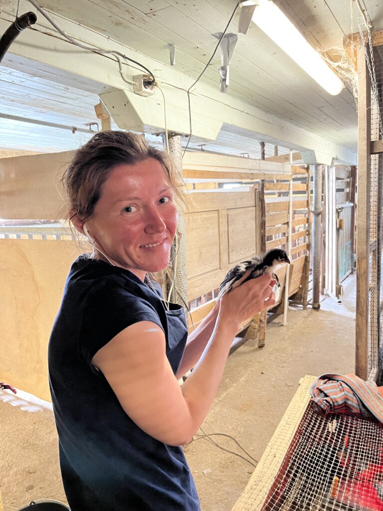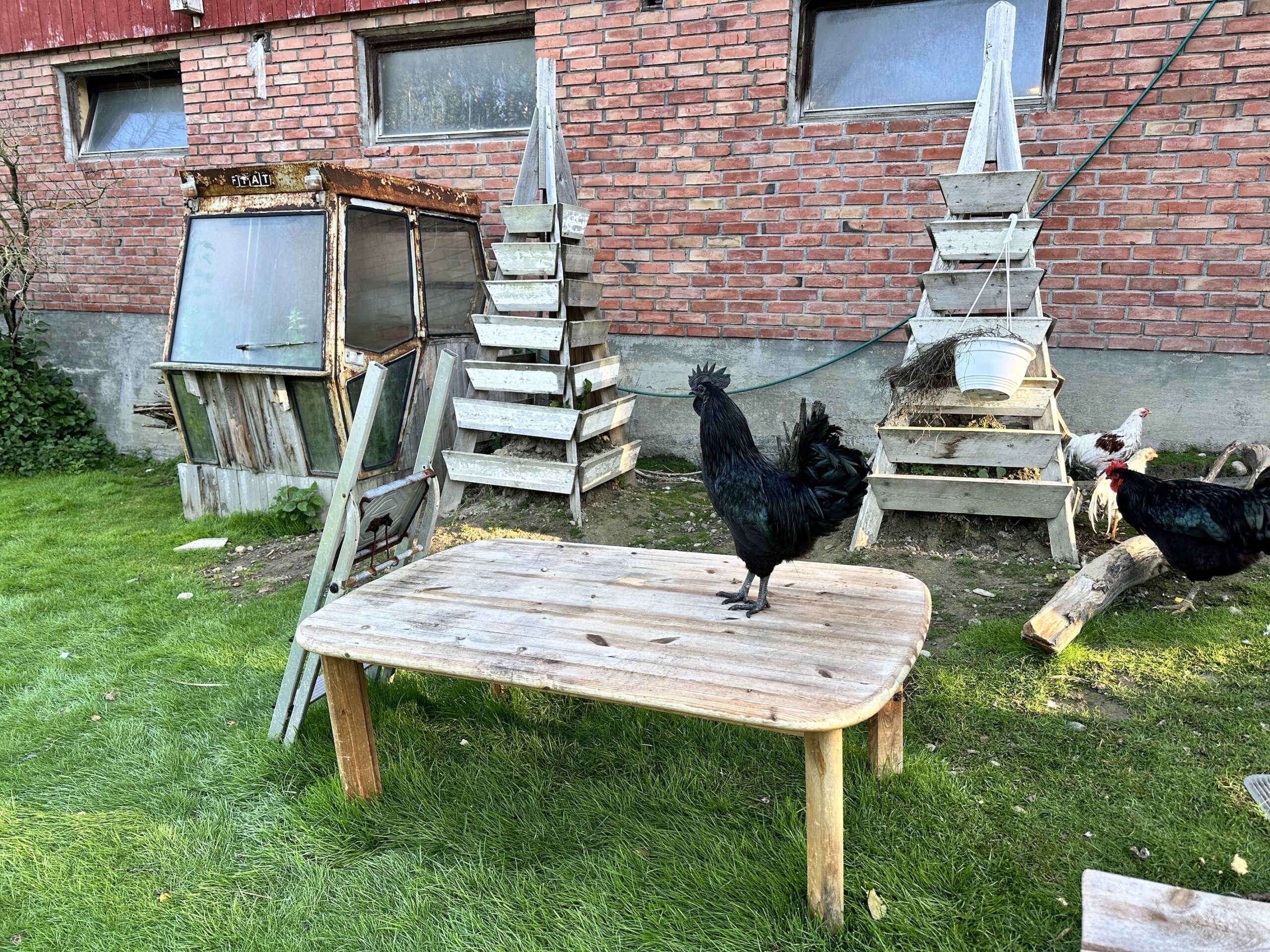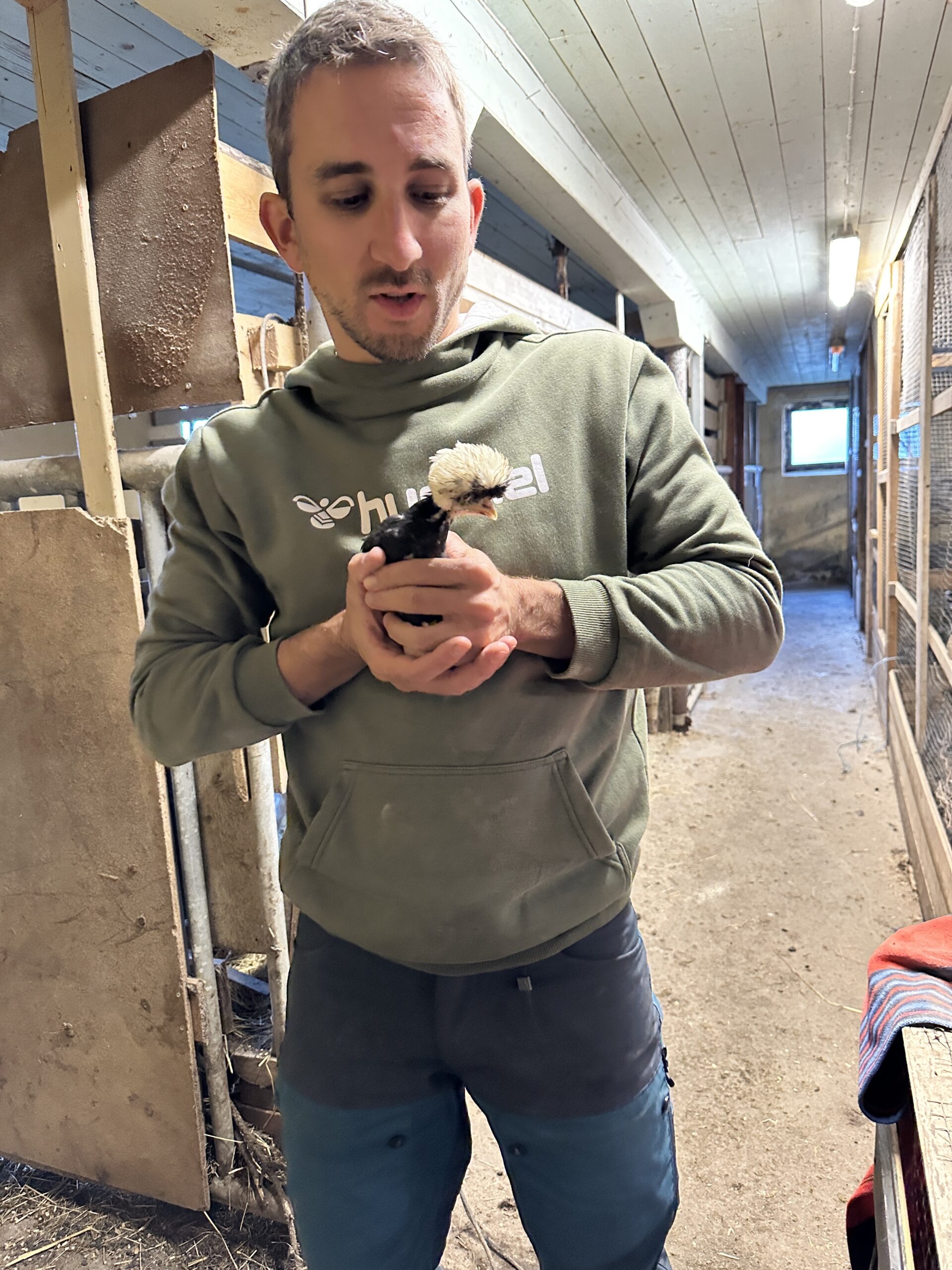 Unser Host züchtet verschiedene Hühnerrassen wie Ayam Cemani (Indonesien), die komplett schwarz sind, bis auf die Knochen. Dann gibt es die Jersey Giants, die größten Hühner der Welt. Es wundert mich nicht, dass sie aus den USA kommen. Die Maran (Frankreich), ebenfalls eine große Hühnerrasse. Die Silverudds, eine schwedische Hühnerrasse, die grüne Eier legt. Überhaupt legt jede Rasse unterschiedlich farbige Eier. Dunkelbraun, hellblau, grün, rosa und beige. Da kann man sich an Ostern das Färben schenken. Ein paar Tage vor unserer Ankunft schlüpfen neue Kücken, darunter eine neue Rasse aus Polen mit lustigem Afro.