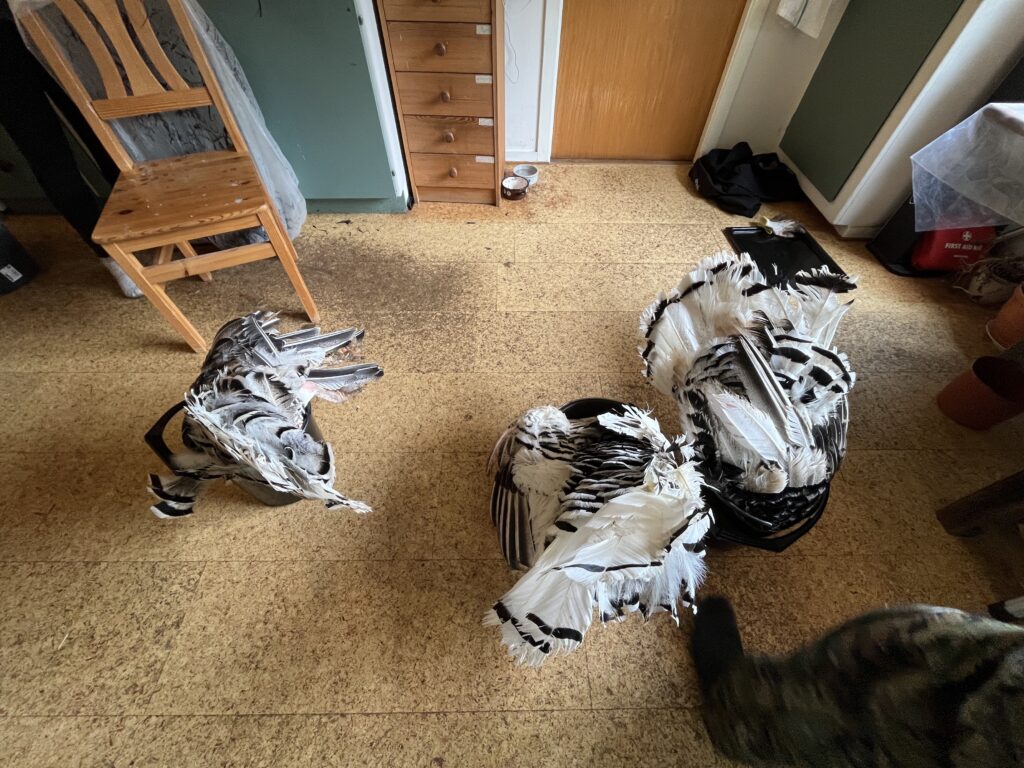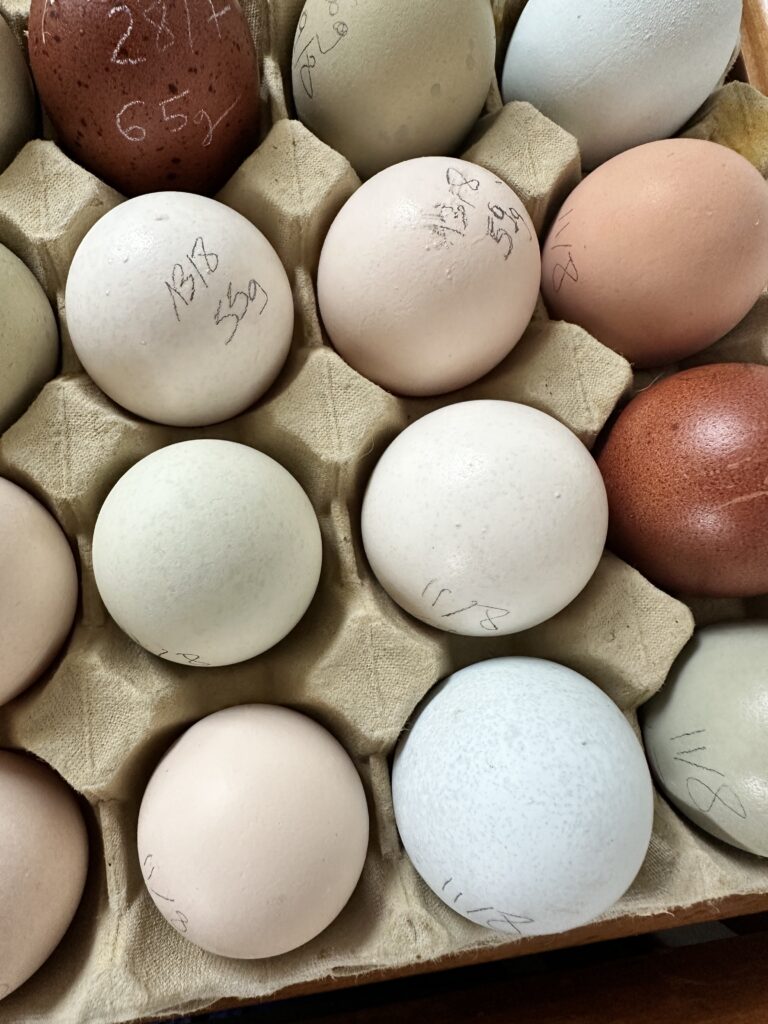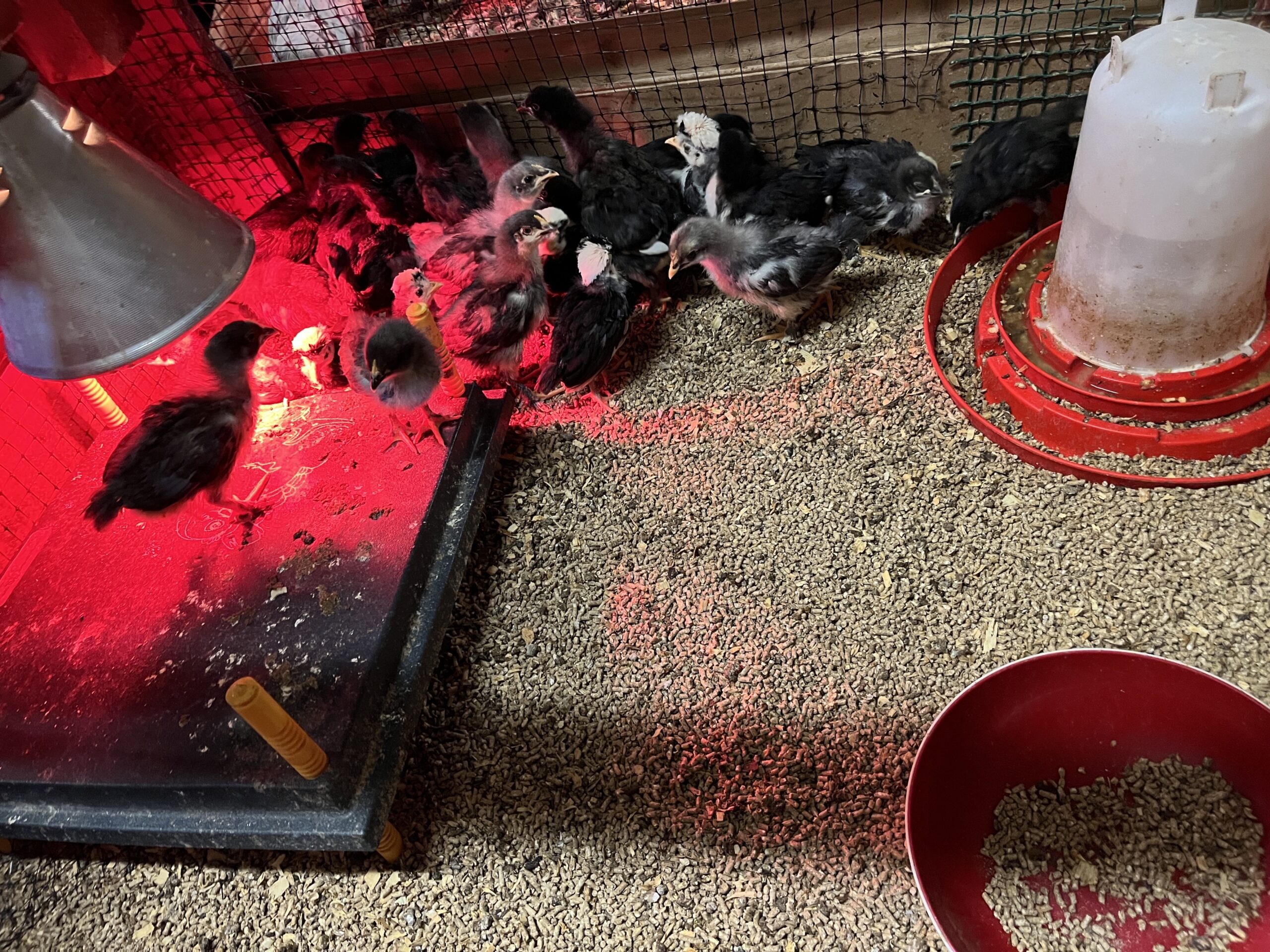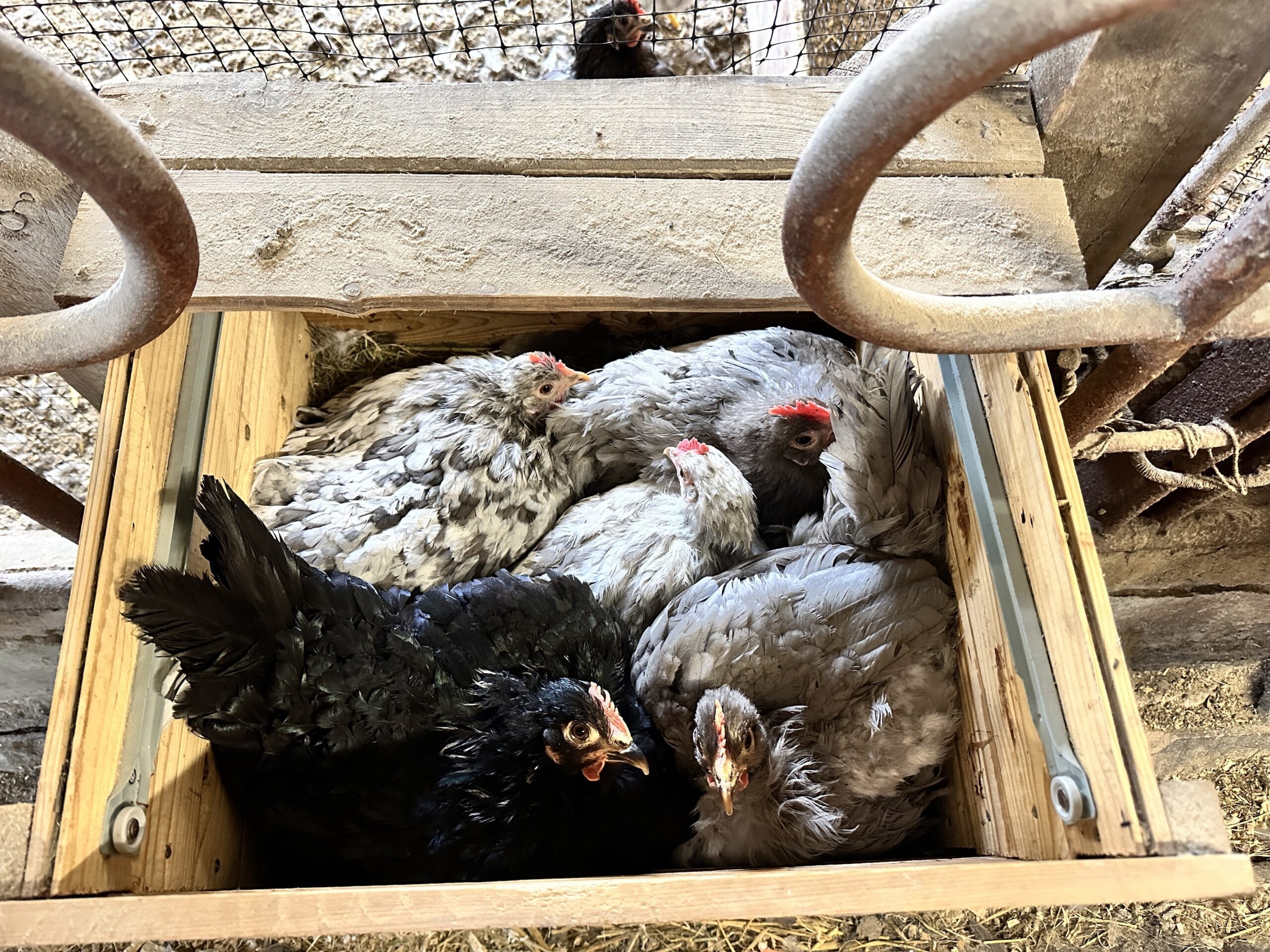 Unser Host züchtet verschiedene Hühnerrassen wie Ayam Cemani (Indonesien), die komplett schwarz sind, bis auf die Knochen. Dann gibt es die Jersey Giants, die größten Hühner der Welt. Es wundert mich nicht, dass sie aus den USA kommen. Die Maran (Frankreich), ebenfalls eine große Hühnerrasse. Die Silverudds, eine schwedische Hühnerrasse, die grüne Eier legt. Überhaupt legt jede Rasse unterschiedlich farbige Eier. Dunkelbraun, hellblau, grün, rosa und beige. Da kann man sich an Ostern das Färben schenken. Ein paar Tage vor unserer Ankunft schlüpfen neue Kücken, darunter eine neue Rasse aus Polen mit lustigem Afro.