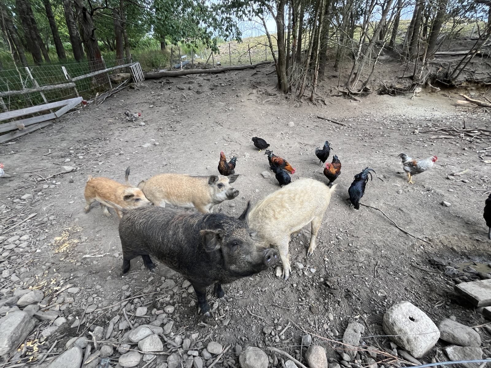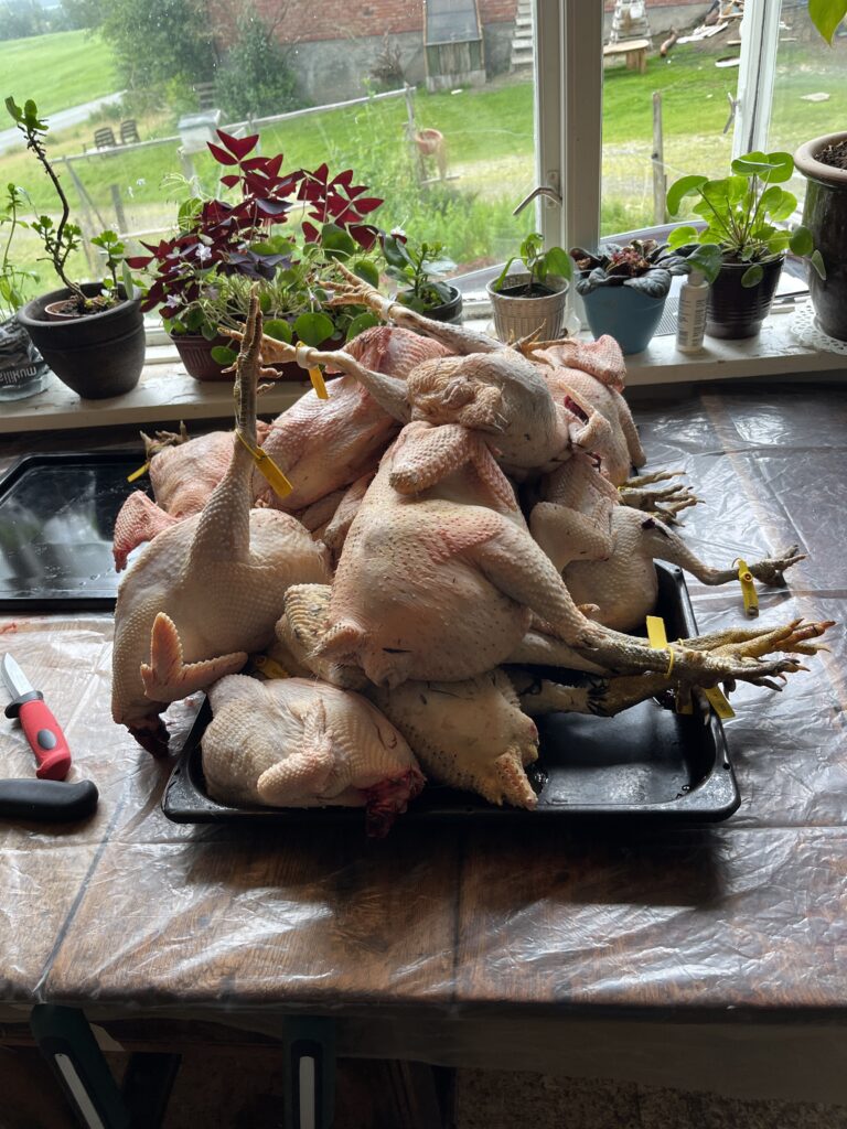 Etwa eine Woche nach unserer Ankunft wird der Hühnerschlachttag verkündet. Damit haben wir nicht gerechnet. Jeder packt mit an. Es ist kein gutes Gefühl, ein Huhn zu töten, dennoch sollte jeder, der Hühnerfleisch oder Eier isst, die Erfahrung gemacht haben und bereit dazu sein. Wir machen alles: vom Kopf abhacken, Federn rupfen, Innereien herausnehmen, Haut abziehen, Füße abtrennen, Brustfleisch heraustrennen, Fett abtrennen, Kochen und Restfleisch herauslösen. Die Küche wird für einen Tag zum Schlachtbetrieb. Alles vom Huhn, was verwendet werden kann, wird verwendet. Aus der Haut werden Hundeleckerli, das Fett wird zum Teil eingeschmolzen und zum Teil an die Schweine verfüttert. Aus den Knochen kochen wir Brühe.