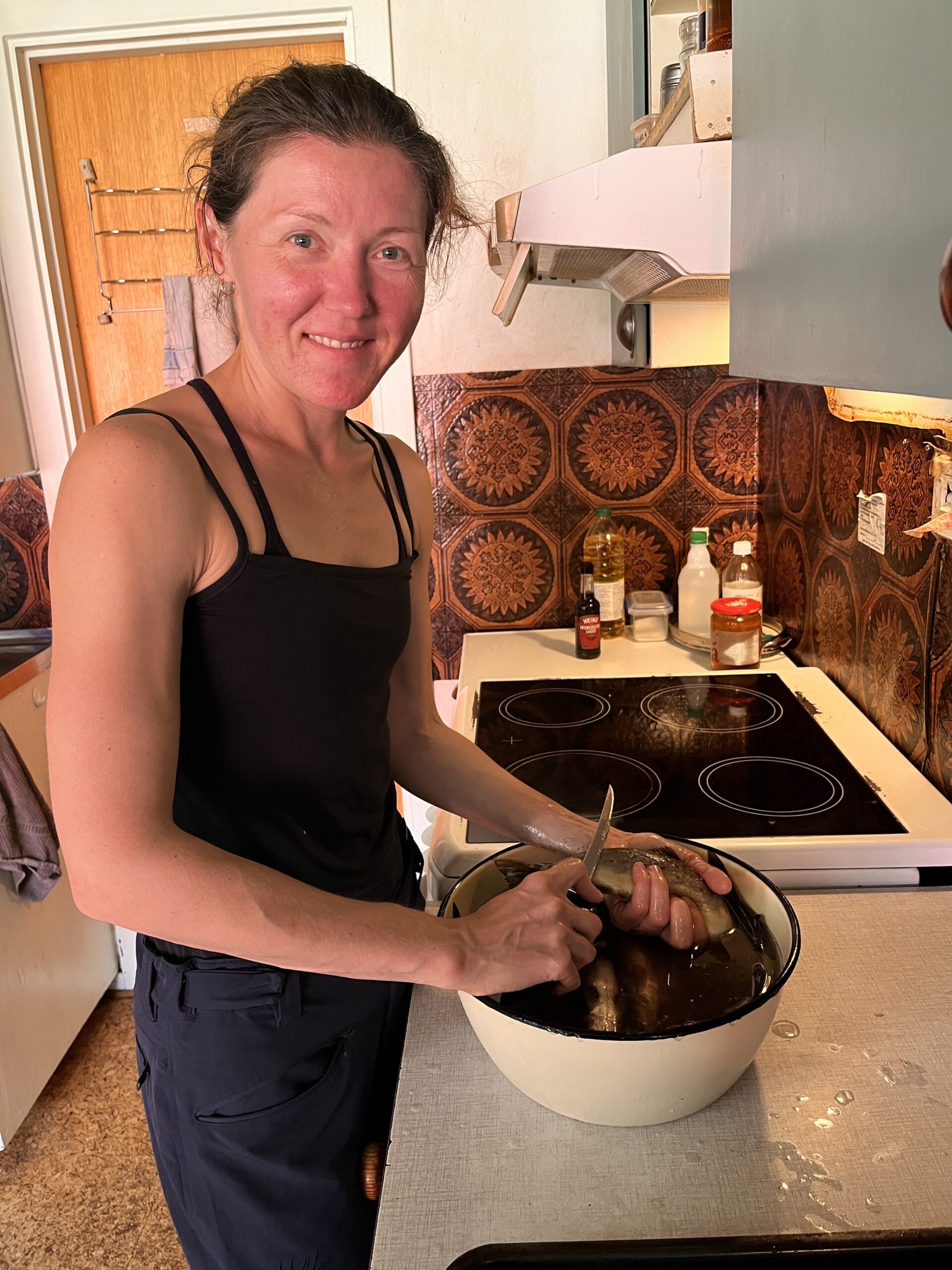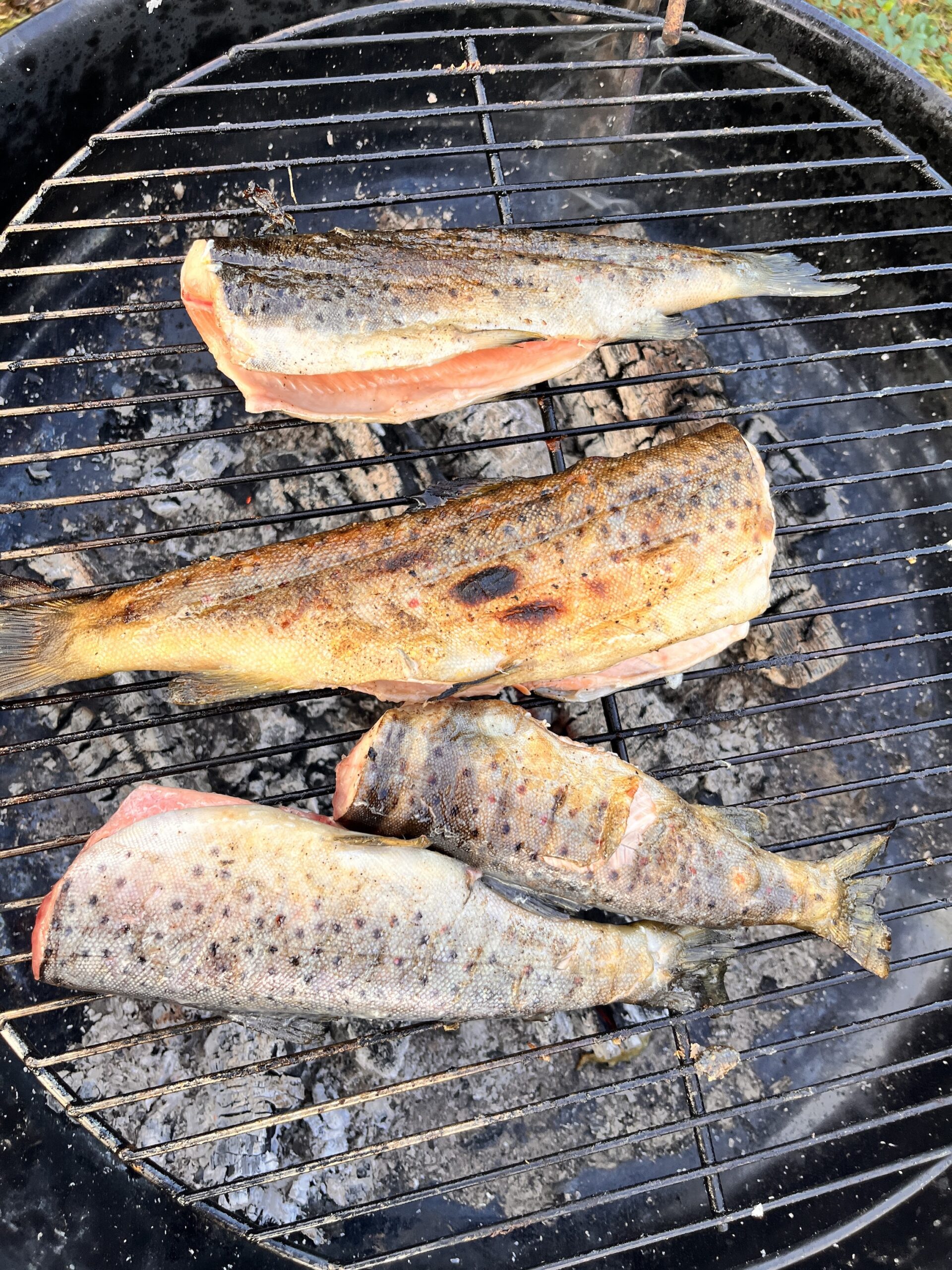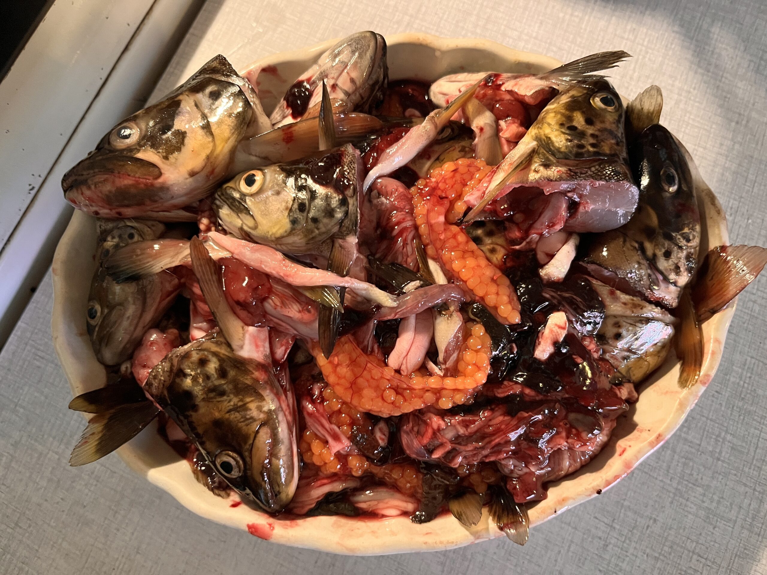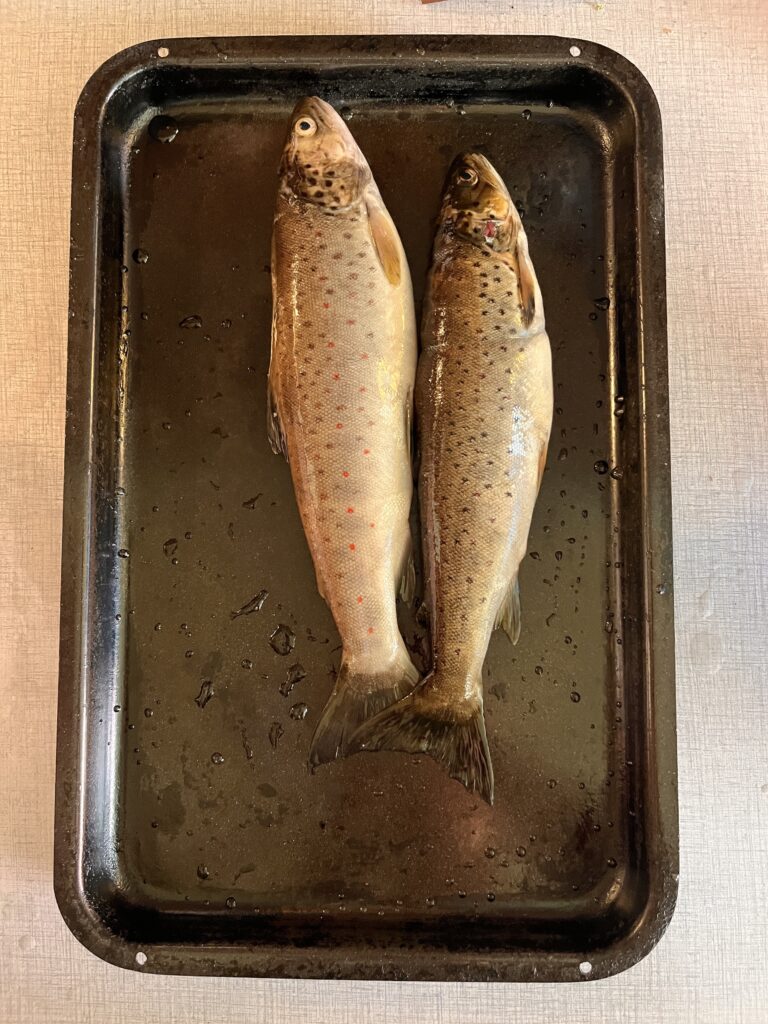 Am nächsten Tag, als wir die Netze herausholen, klappt das Rudern schon viel besser – jetzt macht alles Sinn. Gleich beim ersten Versuch holen wir 18 Forellen aus fünf Netzen. Genug für mindestens ein Abendessen. Der Fisch wird auch gleich nach unserer Rückkehr ausgenommen und am Abend zubereitet. Frischer geht es nicht.