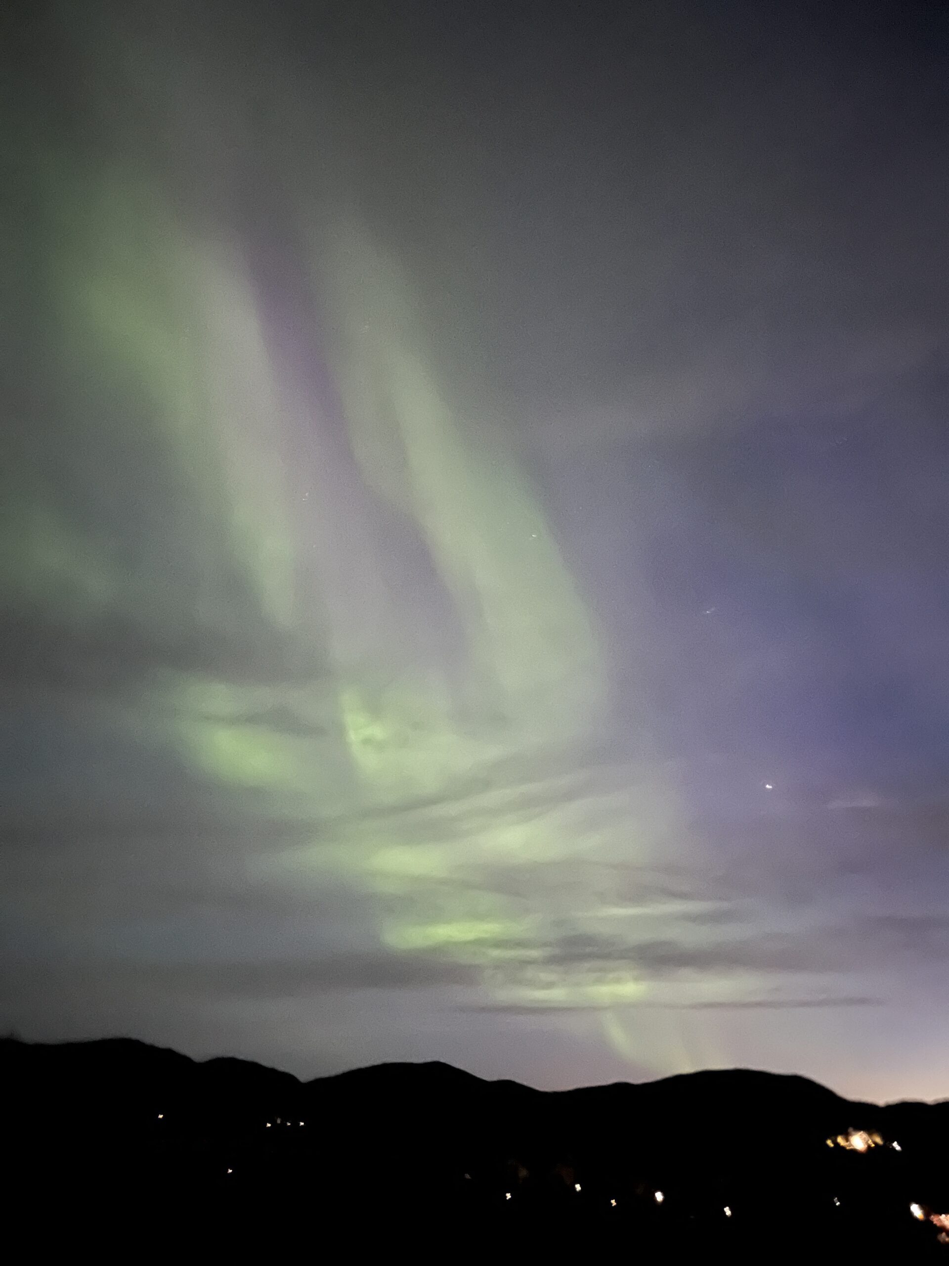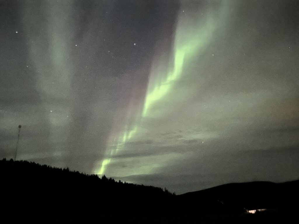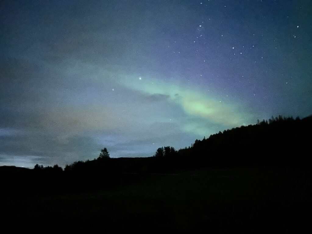 An unserem letzten Abend stehen die Chancen gut, Polarlichter zu sehen, und wir bleiben lange auf. Wir gehen hinauf auf den Hügel hinter der Farm, und die Ziegenherde begleitet uns. Dann ist es soweit: Es beginnt mit tanzenden Wolken, und am Ende sehen wir leicht grünliche Lichter am Himmel. Ein schöner Abschluss für unseren Aufenthalt hier.
