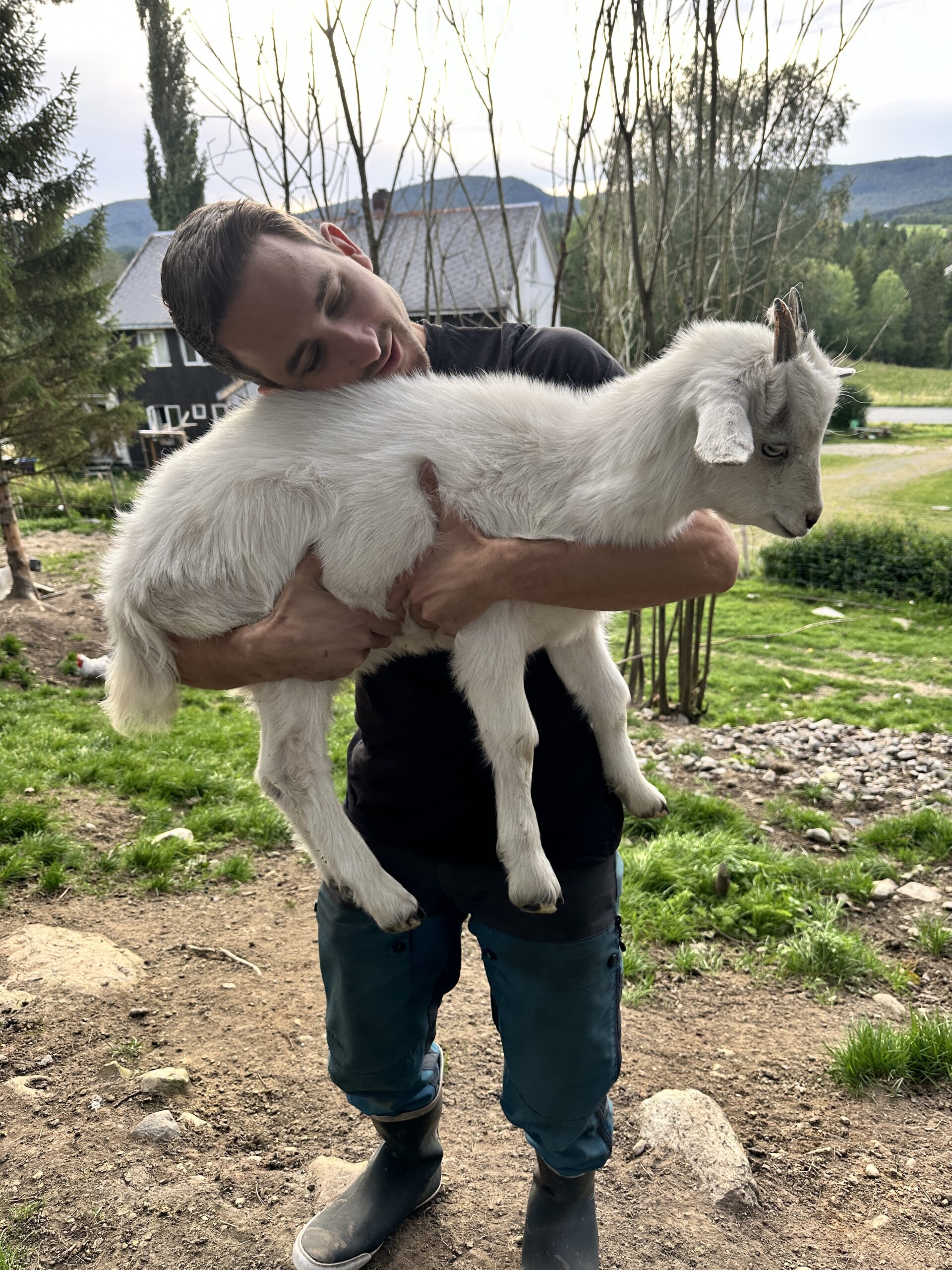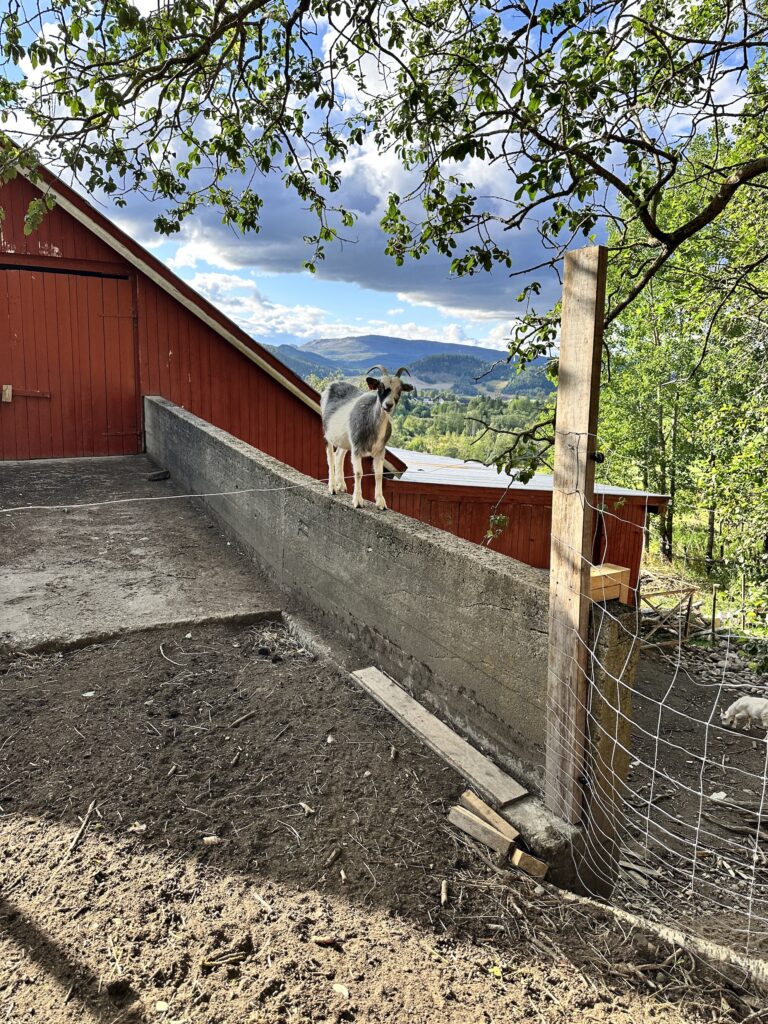 Nach der tollen Workaway-Erfahrung in Portugal wollen wir auch in Norwegen für ein paar Wochen sesshaft werden und jemanden bei seinem Projekt unterstützen. Wir finden eine Farm in einem winzigen Ort, zwei Stunden von Trondheim entfernt. Den nächsten Bahnhof erreicht man in einer halben Stunde mit dem Auto, und Trondheim liegt auf unserer Reiseroute – perfekt! Der Host ist ein Norweger in unserem Alter, der auch schon mehrere Jahre in England und in den USA gelebt hat. Die Farm und das umliegende Land sind seit Jahrhunderten in Familienbesitz. Auf der Farm gibt es Ziegen, Hühner, Schweine, Hasen und einen Hund.