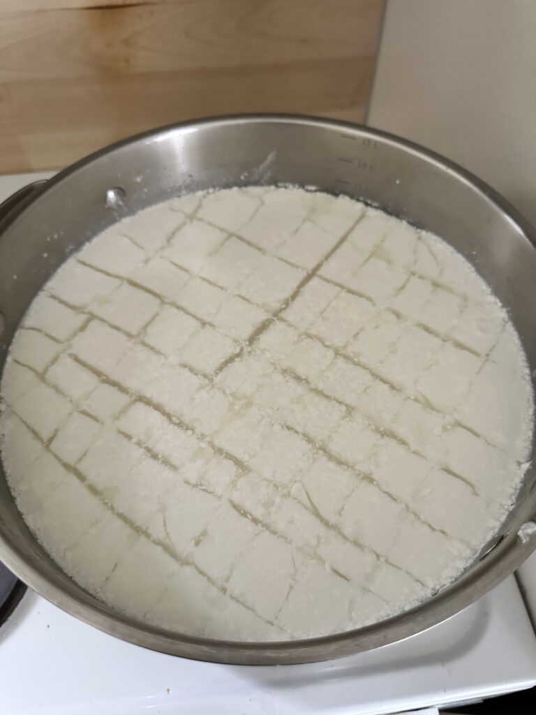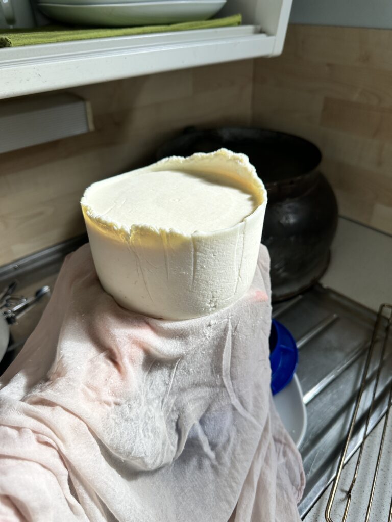 Wie schon erwähnt, gehört Ziegenmelken zu den täglichen Aufgaben. Das bedeutet vier bis fünf Liter Milch täglich, die genutzt werden müssen. Als wir ankommen, gibt es schon Versuche mit Joghurt, Frischkäse und Mozzarella – alles gut, aber nicht lange haltbar. Deshalb konzentriere ich mich auf die Herstellung von Käse, den man lange reifen lassen kann. Alle Versuche sind zumindest optisch erfolgreich. Der Geschmackstest wird dann noch kommen, weil der Käse mindestens 30 Tage reifen sollte. So lange werden wir leider nicht bleiben. Mein einziger Versuch, aus überschüssigem Käsebruch Mozzarella zu machen, scheitert und wird zu „Mozzafeta“.