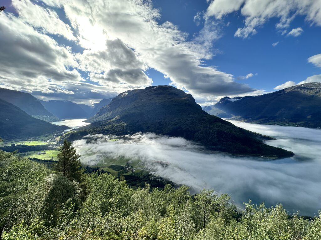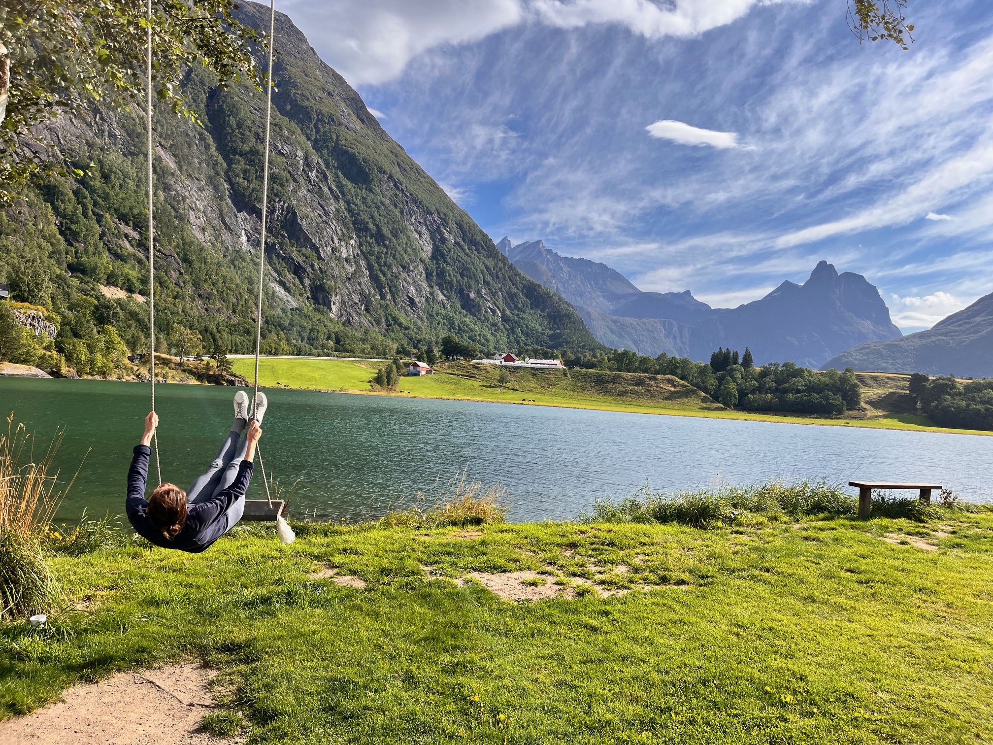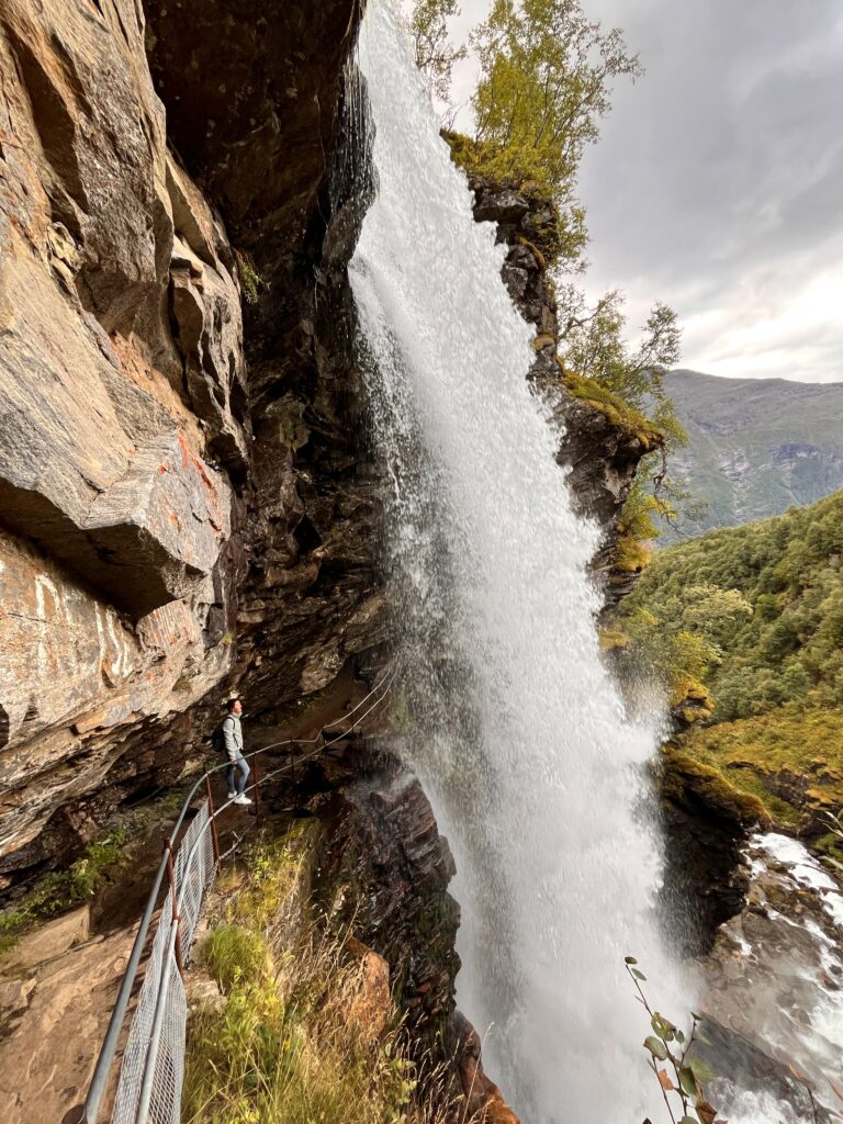Am letzten Tag müssen wir früh aufstehen, heute steht wieder eine Reiseetappe an. Auf die Planung bin ich einigermaßen stolz, denn mit dem heutigen Tag wollen wir das Angenehme mit dem Nützlichen verbinden: Der Bus bringt uns über den Trollstigen mit halbstündigem Fotostopp zur Touriattraktion Nr. 1 in Norwegen, dem Geirangerfjord. Hier haben wir dann Aufenthaltszeit und können später eine Fähre nehmen, um weiter nach Stryn zu kommen. Wir nutzen die Zwischenzeit für eine Wanderung zu einem Wasserfall; am Ende der Wanderung hätten wir beinahe das Highlight verpasst: Am Zielpunkt führt eine unauffällige Treppe hinunter, und man kann auf einem kleinen Pfad hinter den Wasserfall gehen und die Wassermassen von oben herabstürzen sehen – wirklich cool! Auf dem Rückweg stolpert Klara über ihre eigenen Füße und stürzt ziemlich unglücklich – die nächste Hose ist fällig. Wir nehmen die Fähre bis nach Hellesylt und haben somit die obligatorische Fjordfahrt auch schon erledigt . Geiranger selbst ist zwar touristisch, aber jetzt, Mitte September, nicht mehr sonderlich überfüllt. Das Wetter wird schön und der Ausblick ist wirklich fantastisch. Insgesamt kann man Geiranger durchaus als überhyped bezeichnen, aber eine Rundfahrt, eventuell auch mit einem RIB-Boot, würde ich jedem empfehlen, besonders in der Nebensaison. In Hellesylt angekommen, kommt das Problem meiner ach so tollen Planung zum Tragen: Wir verpassen den Bus knapp und haben fast 4 Stunden Wartezeit, die Bordsteine sind um 18 Uhr hier aber bereits hochgeklappt. Als ausgebuffte Reisprofis (wir machen das schließlich hauptberuflich) kennen wir aber die Orte, um die Zeit zu überbrücken: In norwegischen Supermärkten gibt es häufig kleine Cafés, wo es günstigen Kaffee und gratis WLAN gibt – so auch in Hellesylt; hier hängen wir bis 20 Uhr ab. Dann schließt auch im Supermarkt das letzte geöffnete Lokal, wir ziehen deshalb weiter zum örtlichen Campingplatz. Hier hängt, professionell auf einem Post-it notiert, das Passwort an der Außenseite der Tür. Somit haben wir wieder WLAN, Sitzgelegenheit und Bad. Man wird ein bisschen zum Überlebenskünstler auf Reisen. Um 22 Uhr kommt tatsächlich noch ein Bus und bringt uns in einer Stunde nach Stryn.