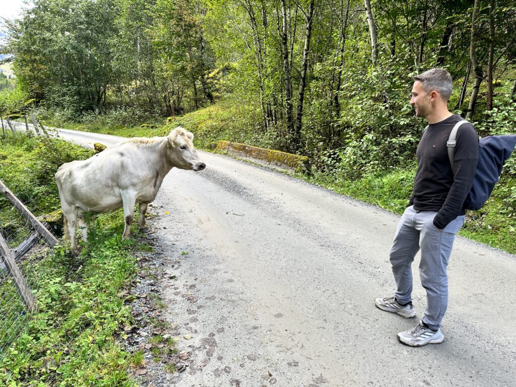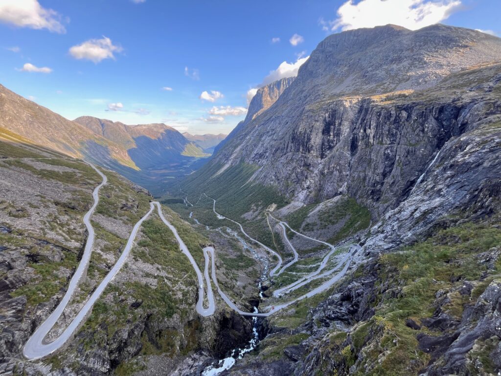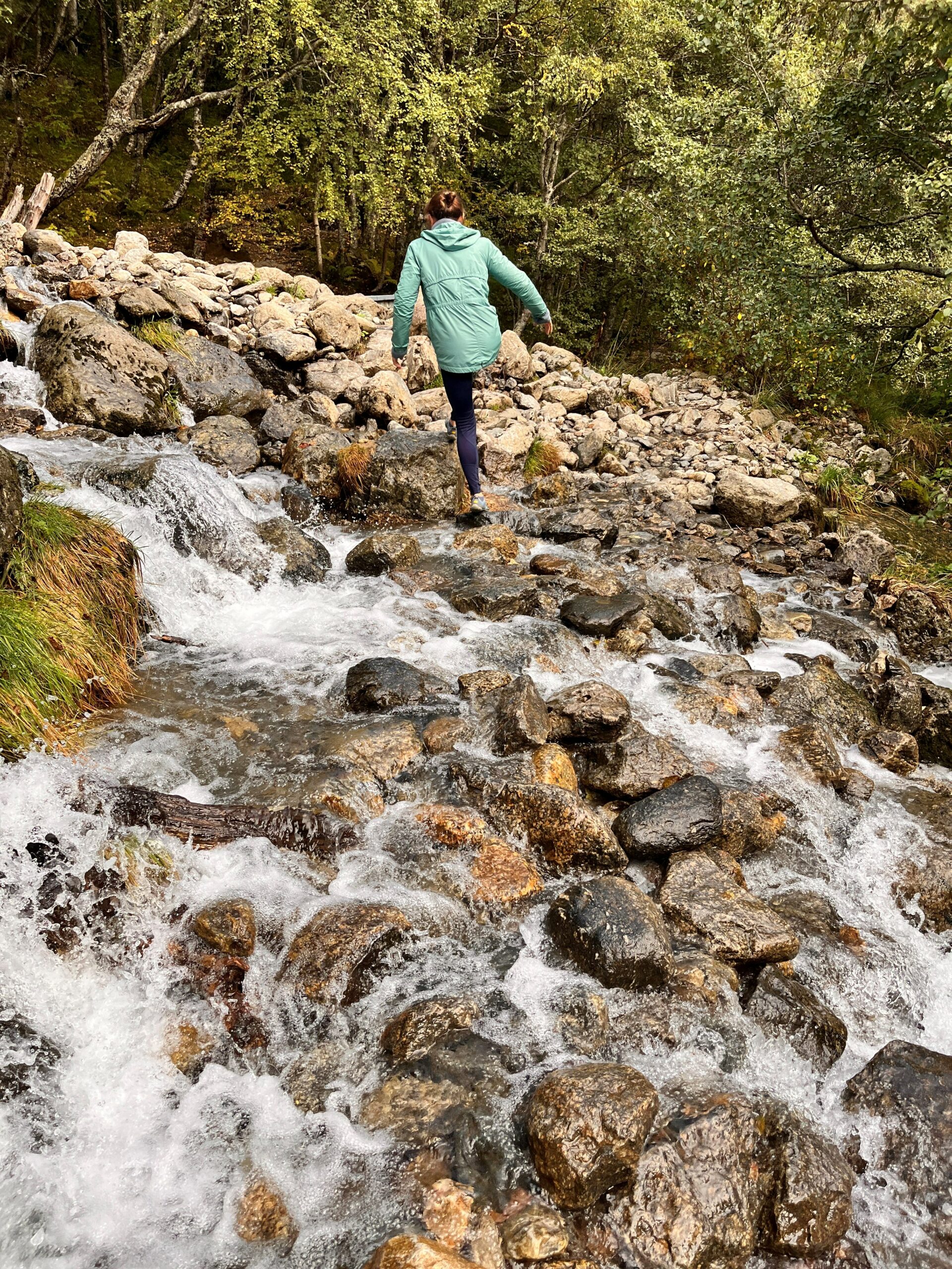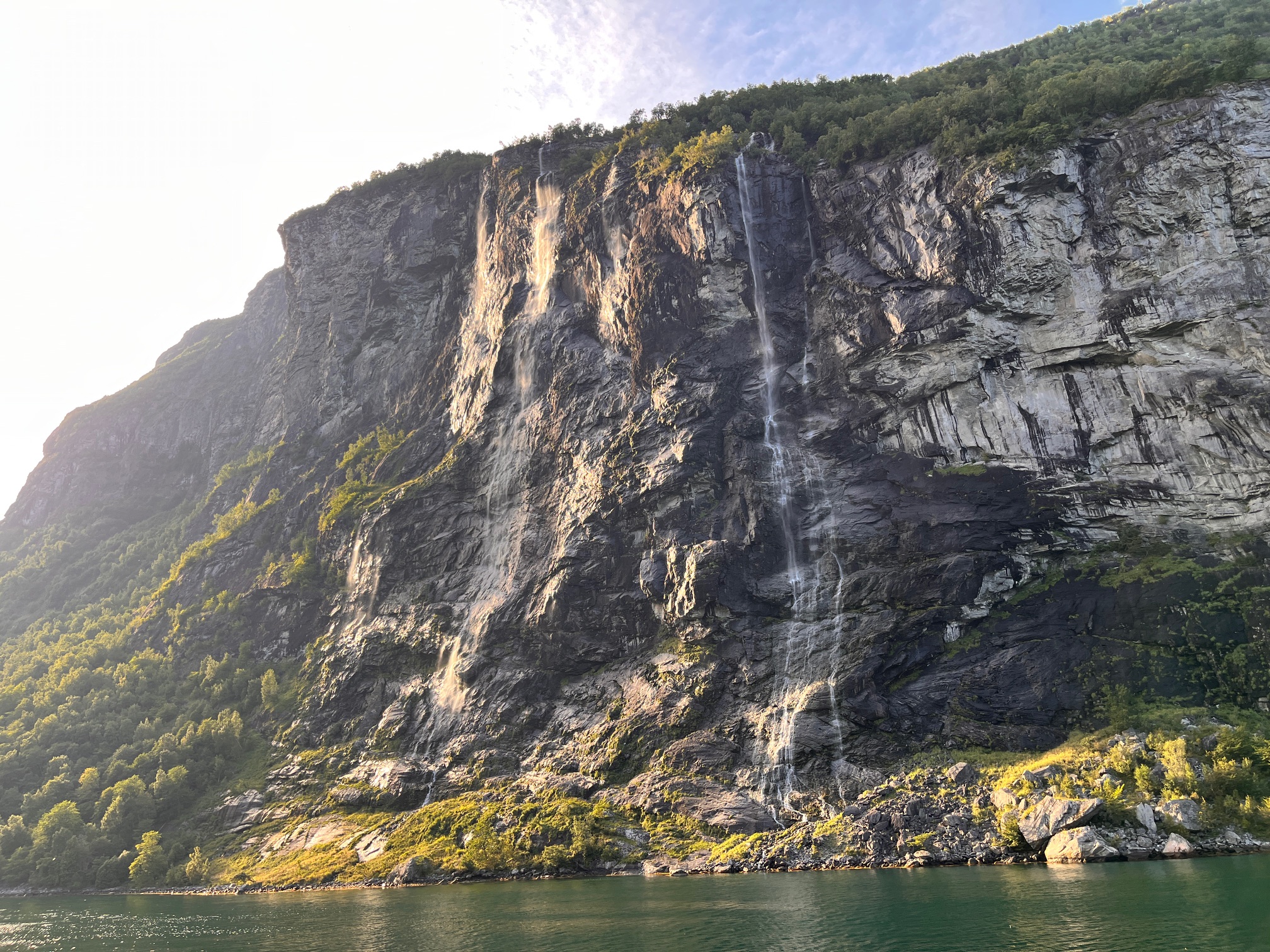Am letzten Tag müssen wir früh aufstehen, heute steht wieder eine Reiseetappe an. Auf die Planung bin ich einigermaßen stolz, denn mit dem heutigen Tag wollen wir das Angenehme mit dem Nützlichen verbinden: Der Bus bringt uns über den Trollstigen mit halbstündigem Fotostopp zur Touriattraktion Nr. 1 in Norwegen, dem Geirangerfjord. Hier haben wir dann Aufenthaltszeit und können später eine Fähre nehmen, um weiter nach Stryn zu kommen. Wir nutzen die Zwischenzeit für eine Wanderung zu einem Wasserfall; am Ende der Wanderung hätten wir beinahe das Highlight verpasst: Am Zielpunkt führt eine unauffällige Treppe hinunter, und man kann auf einem kleinen Pfad hinter den Wasserfall gehen und die Wassermassen von oben herabstürzen sehen – wirklich cool! Auf dem Rückweg stolpert Klara über ihre eigenen Füße und stürzt ziemlich unglücklich – die nächste Hose ist fällig. Wir nehmen die Fähre bis nach Hellesylt und haben somit die obligatorische Fjordfahrt auch schon erledigt . Geiranger selbst ist zwar touristisch, aber jetzt, Mitte September, nicht mehr sonderlich überfüllt. Das Wetter wird schön und der Ausblick ist wirklich fantastisch. Insgesamt kann man Geiranger durchaus als überhyped bezeichnen, aber eine Rundfahrt, eventuell auch mit einem RIB-Boot, würde ich jedem empfehlen, besonders in der Nebensaison. In Hellesylt angekommen, kommt das Problem meiner ach so tollen Planung zum Tragen: Wir verpassen den Bus knapp und haben fast 4 Stunden Wartezeit, die Bordsteine sind um 18 Uhr hier aber bereits hochgeklappt. Als ausgebuffte Reisprofis (wir machen das schließlich hauptberuflich) kennen wir aber die Orte, um die Zeit zu überbrücken: In norwegischen Supermärkten gibt es häufig kleine Cafés, wo es günstigen Kaffee und gratis WLAN gibt – so auch in Hellesylt; hier hängen wir bis 20 Uhr ab. Dann schließt auch im Supermarkt das letzte geöffnete Lokal, wir ziehen deshalb weiter zum örtlichen Campingplatz. Hier hängt, professionell auf einem Post-it notiert, das Passwort an der Außenseite der Tür. Somit haben wir wieder WLAN, Sitzgelegenheit und Bad. Man wird ein bisschen zum Überlebenskünstler auf Reisen. Um 22 Uhr kommt tatsächlich noch ein Bus und bringt uns in einer Stunde nach Stryn.