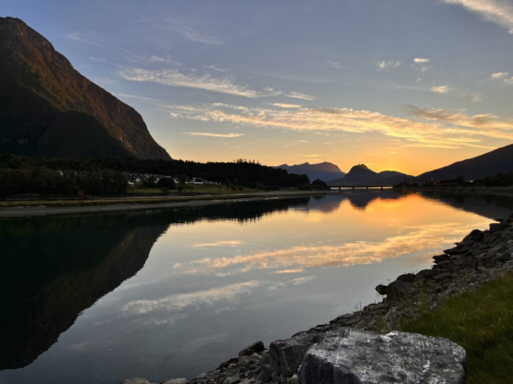 Auf dem Weg nach Åndalsnes bekommen wir einen Nachteil der zerklüfteten, wunderschönen Fjordlandschaft zu spüren: Selbst für relativ kurze Distanzen sind hier lange Busfahrten nötig, Züge gibt es an der Westküste kaum. So brauchen wir für die Distanz von Trondheim nach Åndalsnes mehr als 6 Stunden mit dem Bus für gerade einmal 260 km Strecke. Natürlich ist das nicht nur ein Nachteil, denn die Sicht durch das Busfenster ist eigentlich immer gut. In Åndalsnes haben wir perfektes Wetter für eine Wanderung zum Romsdalseggen erwischt. Wie bei bisher allen unseren Wanderungen in Norwegen ist auch hier der Aufstieg schweißtreibend, wird aber mit einer spektakulären Aussicht belohnt. So ganz können wir die Farm noch nicht hinter uns lassen, und so nutzen wir den nächsten Tag, um den Wald auszukundschaften und Heidelbeeren und Pilze zu pflücken – eine Gewohnheit, die wir schon in Trondheim begonnen haben und die wir die nächsten Tage auch weiterführen werden. Das Frühstück ist somit schon mal gepimpt ;- ) Wir leihen ein Kanu und paddeln ein bisschen über den Fluss. Die Ruhe hier ist herrlich, nur die Schießübungen des nahegelegenen Militärgeländes hallen durch das Tal und nerven ein bisschen.