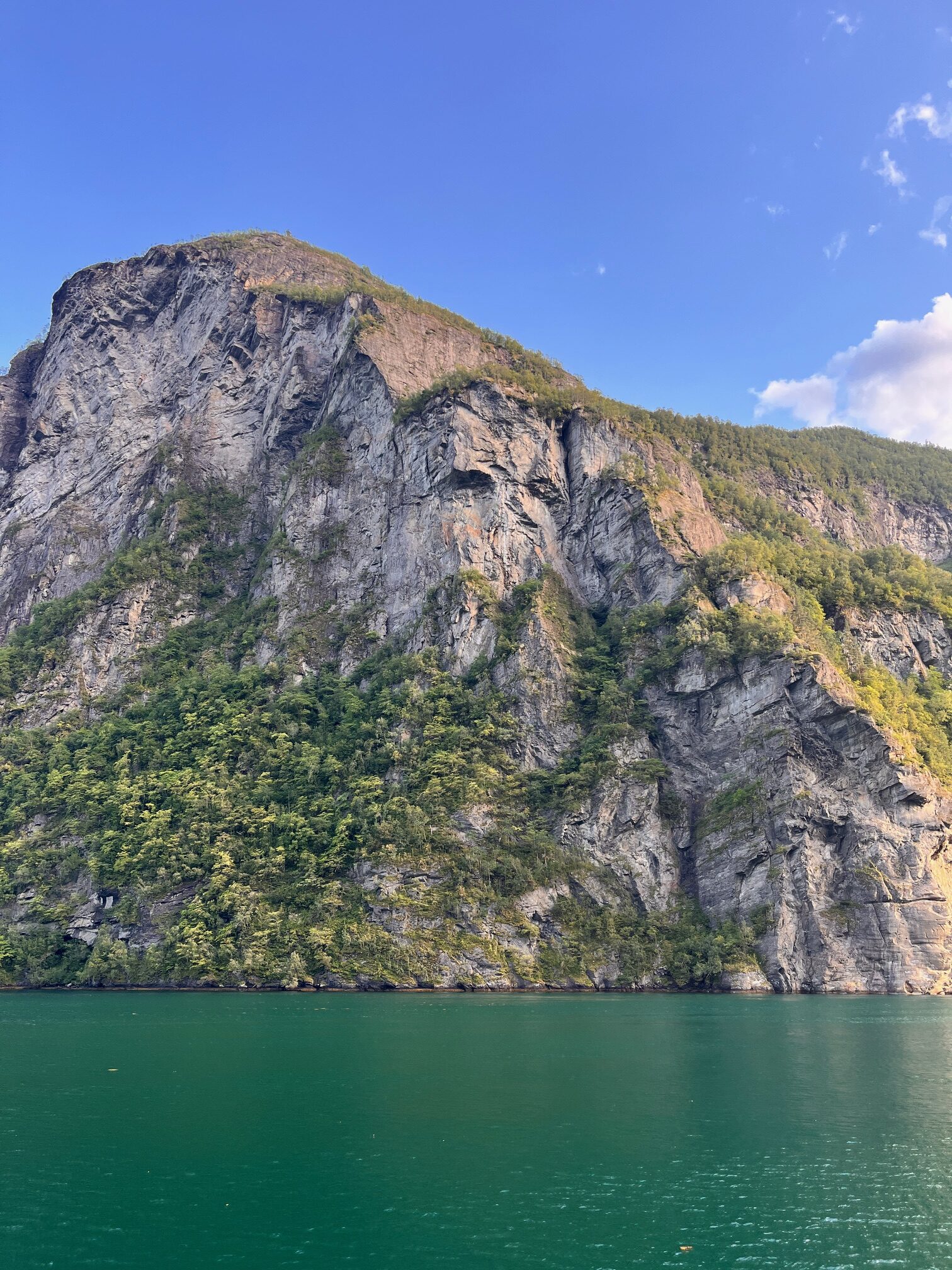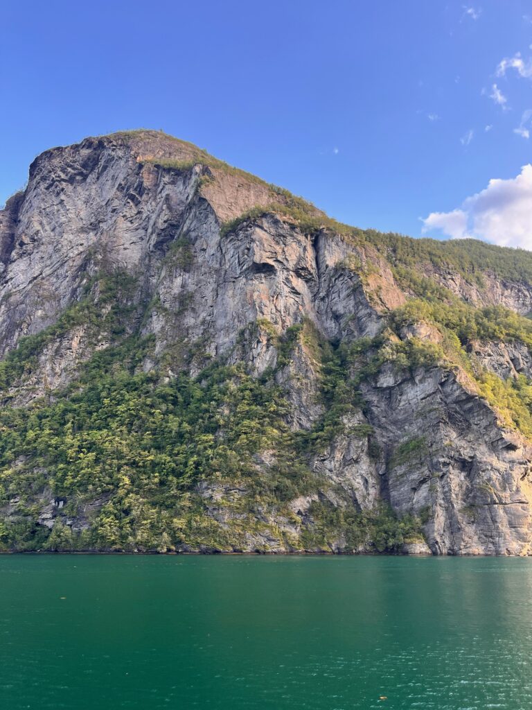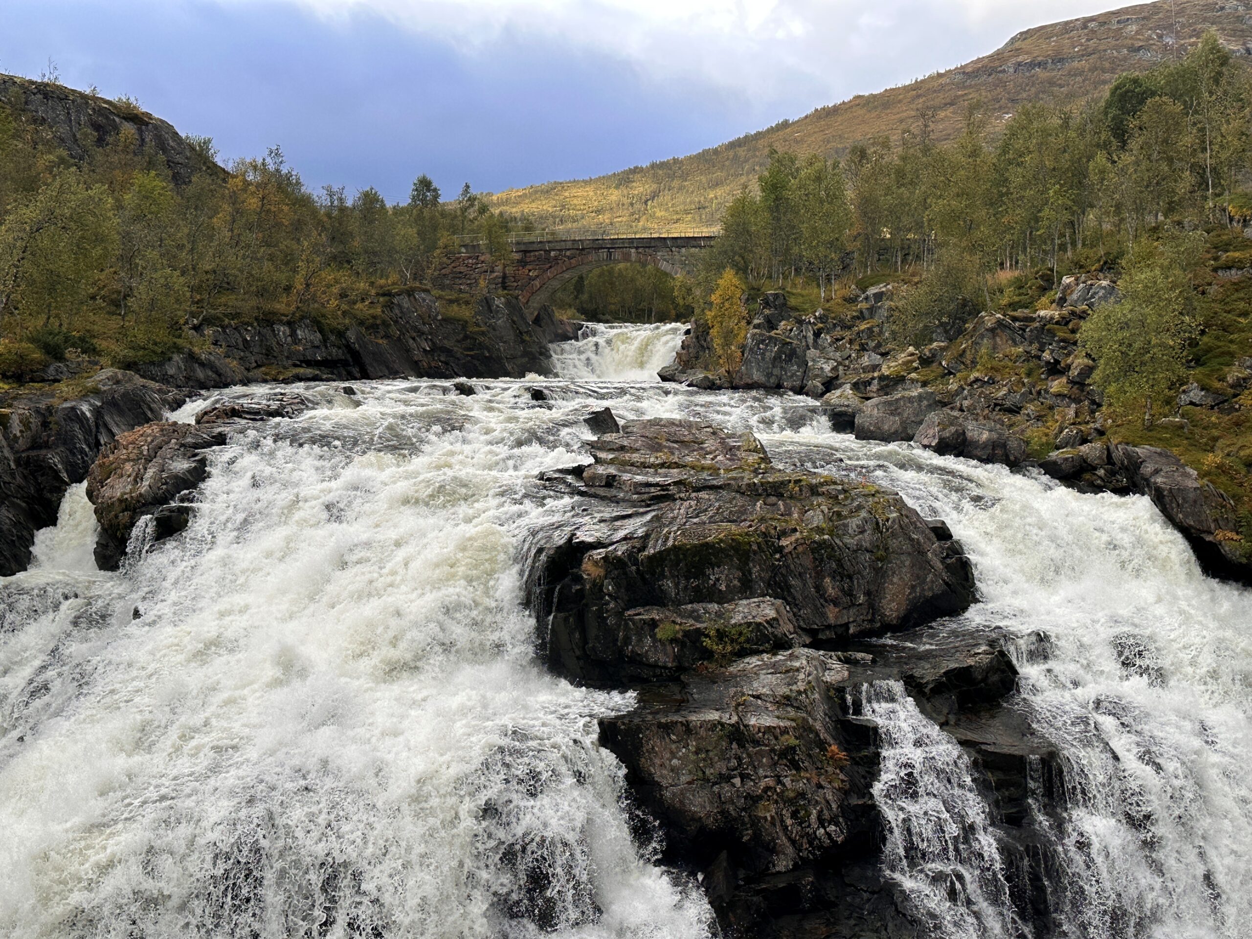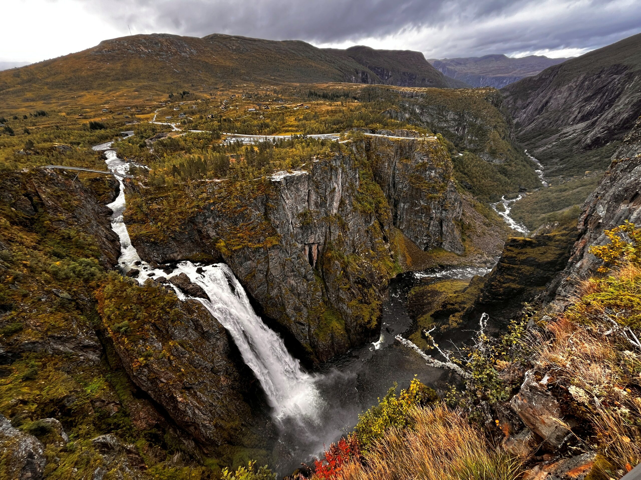 Die nächste Reiseetappe toppt die bisher dagewesenen, ganze neun Stunden sind wir mit fünf verschiedenen Bussen unterwegs. Und auch wenn die Busse hier gerne mal verspätet sind (der norwegische Busfahrer (m/w/d) ist an sich eher ein entspannter Geselle), klappt verrückterweise alles nach Plan und wir kommen pünktlich in Eidfjord an. Es ist jetzt Mitte September und der Herbst startet durch. Auf die Wettervorhersage kann man sich auch 24 Stunden vorab nicht verlassen. Für das Wetter ist heute Gegenteiltag. Trotzdem schaffen wir es, eine kurze Wanderung zu einer historischen Grabstätte und zu einem der berühmtesten Wasserfälle des Landes, dem Vøringsfossen, zu machen. Das Ganze runden wir mit einer Fährfahrt durch den Hardangerfjord ab, die es meiner Meinung nach durchaus mit Geiranger aufnehmen kann, ohne dabei zu touristisch zu sein.