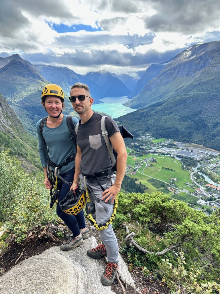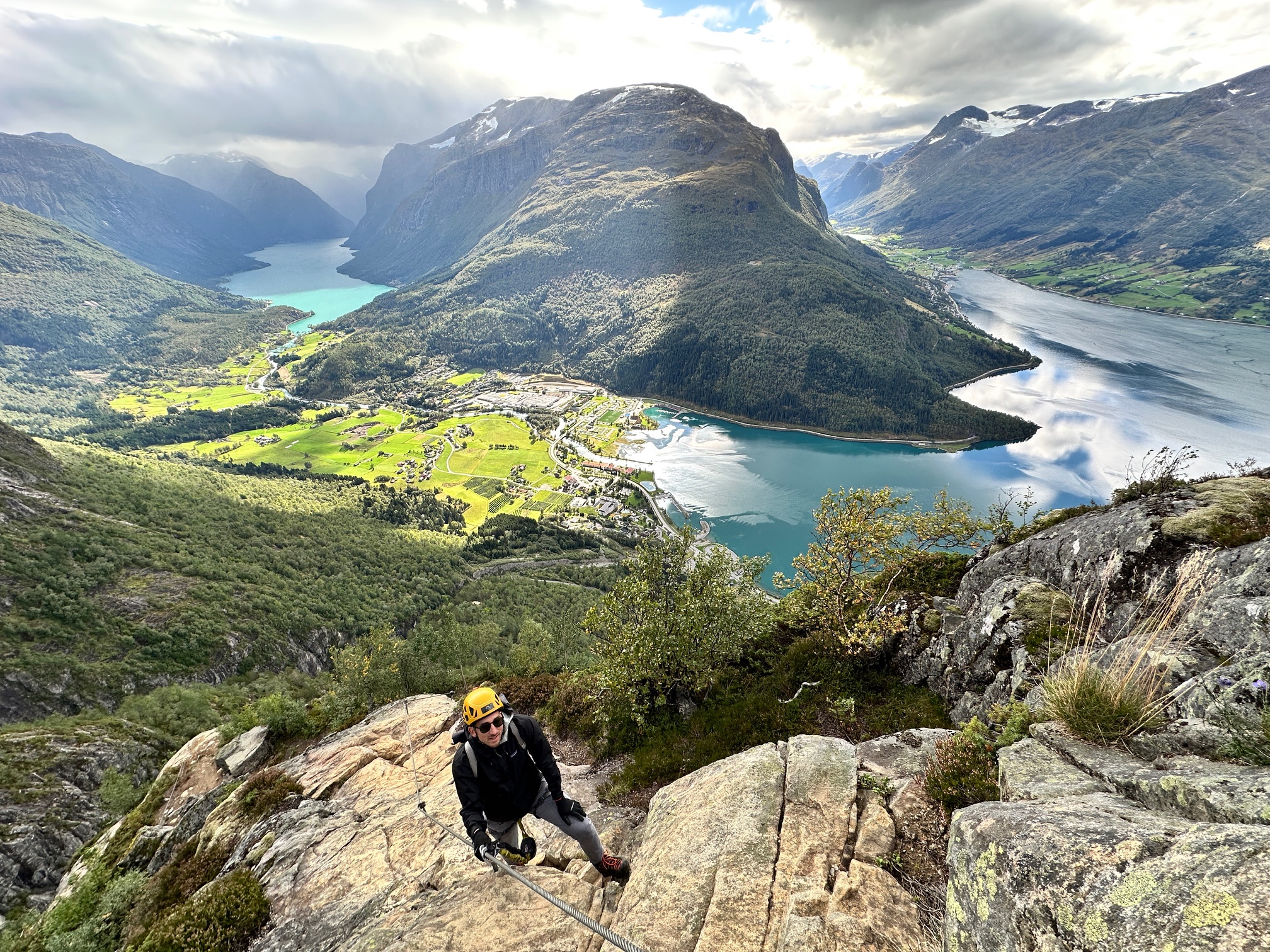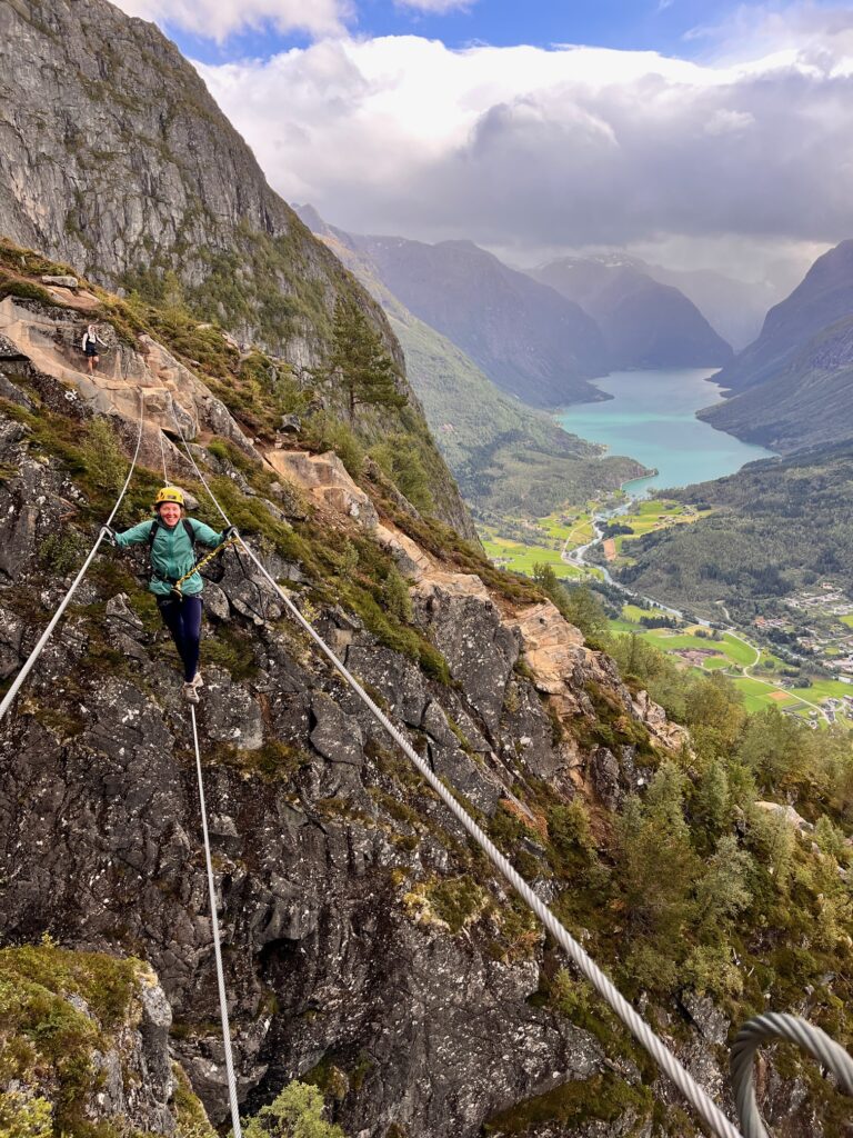 Nach Stryn verschlägt es uns vor allem zu einem Ziel: Die Via Ferrata in Loen. Ich wollte mich schon immer mal im Klettern probieren und Norwegen ist sicherlich nicht die schlechteste Gegend, um damit anzufangen. An Tag eins macht uns das Wetter einen Strich durch die Rechnung. Wir müssen den Aufenthalt verlängern und alles einen Tag nach hinten schieben – jetzt, in der Nebensaison kein Problem. Das Warten hat sich dann aber gelohnt. Am nächsten Tag haben wir ideales Outdoorwetter. Wir laufen los, in einer Gruppe mit einigen (scheinbar) lustigen Norwegern, zwei Polen, einem Amerikaner und einem Neuseeländer. Zuerst geht es den “Monster-Hill” hinauf, wirklich steil und anstrengend. Dann kommt der erste Kletterpart, der Jungfrauberg, wie mir einer der lustigen Norweger erklärt. Hier wird an einem einfachen Felsen die Technik von der netten Guide erklärt und wir dürfen alle mal ran an den Berg. Dann geht’s über mehrere Abschnitte in verschiedenen Schwierigkeitsgraden, eine steile Hängeleiter (“stairway to heaven”), eine Hängebrücke und als Highlight über ein Seil, das über eine Schlucht gespannt ist, nach oben. Der Aufstieg macht Spaß und ist viel weniger anstrengend als der Teil zu Fuß. Stellenweise geht der Adrenalinspiegel schon deutlich nach oben. Die Aussicht von hier oben ist eine der besten in Norwegen, wie ich finde. Zurück geht’s mit der Gondel, die völlig unspektakulär und für den irren Preis von 460 NOK one way (in unserem Fall inklusive) auch viel zu kurz ist. Wir finden es trotzdem ganz akzeptabel, den Weg nicht zu Fuß nach unten gehen zu müssen. Ein guter Start fürs Klettern, mal sehen, was uns da auf der Reise noch so begegnen wird 🙂