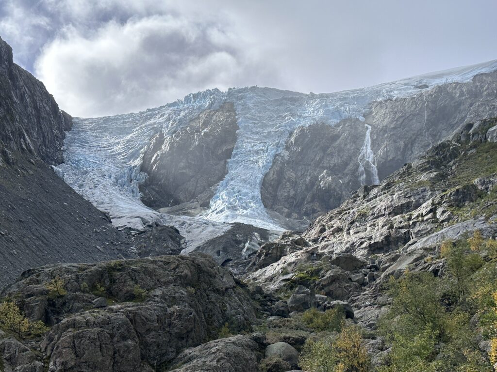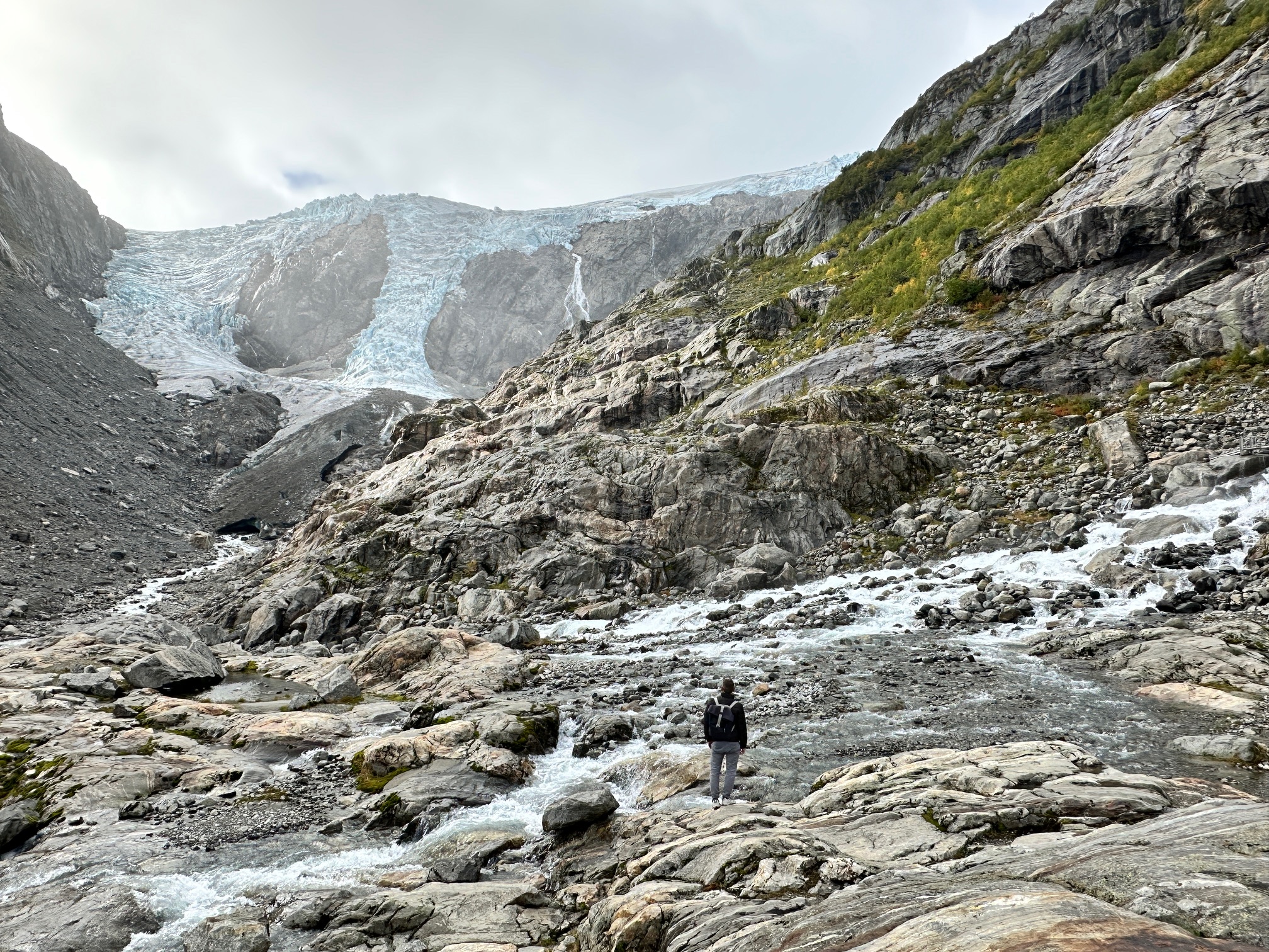 Den Ort Odda kennt man vor allem als Ausgangspunkt für eines der nächsten Touristenhighlights, nämlich die Wanderung zur Trolltunga – Instagram lässt grüßen. Als bekenennde social-media-Pappnasen spielt Instagram für uns keine Rolle und wir können somit beruhigt auf die Trolltunga verzichten. Dafür starten wir eine andere Wanderung zum Buarbreen, einem Gletscher ganz in der Nähe. Es ist einer der abwechslungsreichsten Aufstiege bisher, es geht durch den Wald, über Klippen, Brücken und durch Flüsse. Ausnahmsweise kommt man dieses Mal auch nicht sonderlich ins Schwitzen. Und ganz zum Schluss steht man vor einem Gletscher, genauer gesagt nur einem Zipfel des drittgrößten Gletschers von Norwegen. Im Sonnenschein schimmert das Eis blau, kühle Luft strömt vom Berg auf uns herab. Ein bisschen Ehrfurcht kommt dabei schon auf – schade für zukünftige Generationen, dass sie das wahrscheinlich nicht mehr erleben werden.