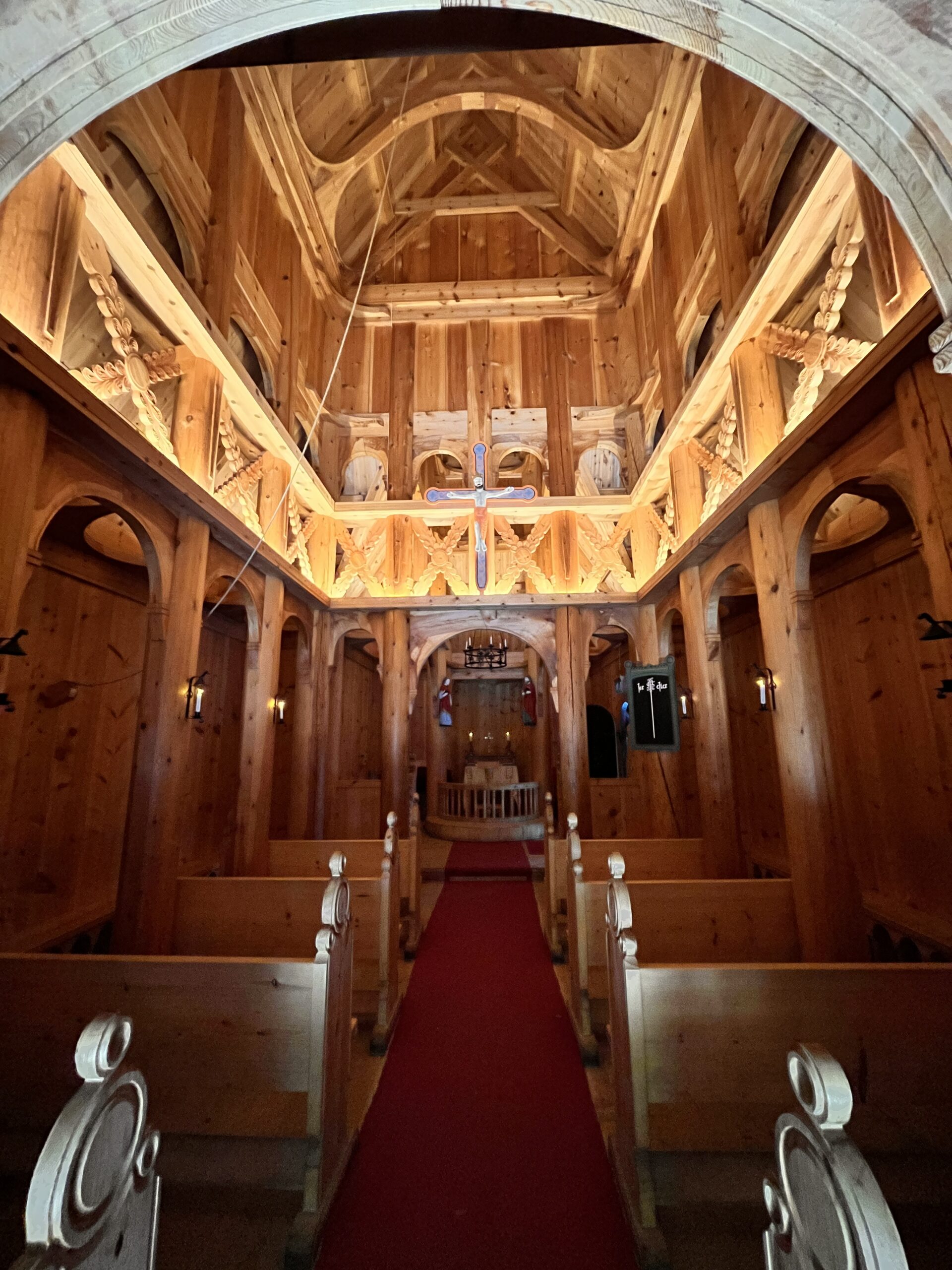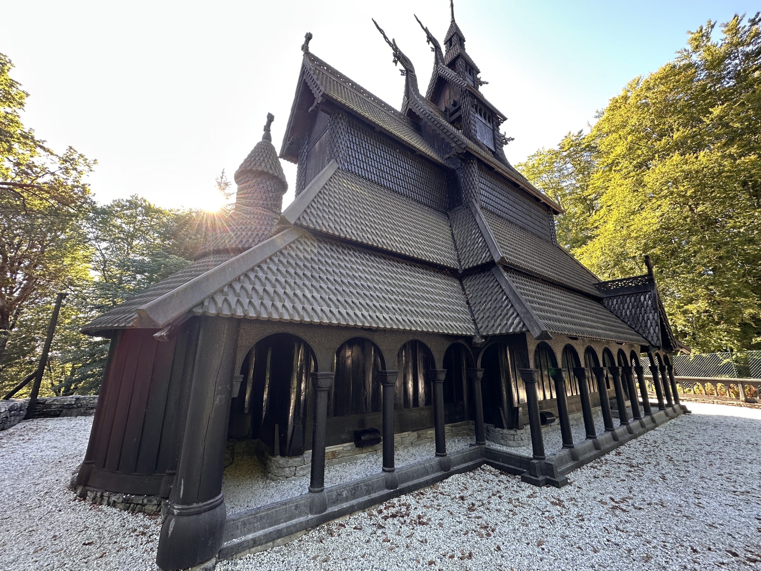 Bei einer Free-Walking-Tour lernen wir, dass Bergen einen talentierten Komponisten hervorgebracht hat. Seinen Namen haben wir noch nie gehört, und ich muss ihn für den Beitrag auch noch mal googeln – aber die Stücke kennt wahrscheinlich jeder, vor allem aus Disneyfilmen: Edvard Grieg, falls jemand reinhören will. Fast alle Häuser in Bergen sind aus Holz – ein Grund, weshalb die Stadt schon mehrfach durch Feuer in Mitleidenschaft gezogen wurde. 1702 zerstörte ein Feuer fast die ganze Stadt. Sie wurde dann nach altem Vorbild wieder aufgebaut. Etwas außerhalb der Stadt besuchen wir eine kleine Stabkirche. Sie sind typisch für Skandinavien und wurden in der Übergangsphase von heidnischen Religionen zum Christentum gebaut. Diese hier stand früher mal woanders und wurde nach dem Ikea-Prinzip hier wieder aufgebaut.