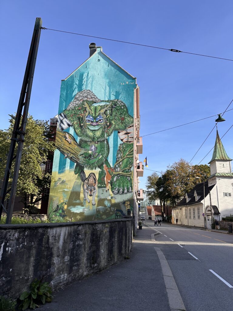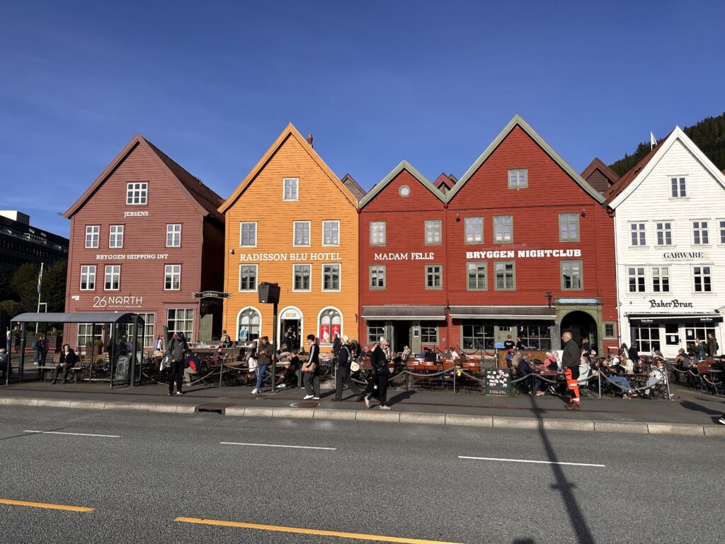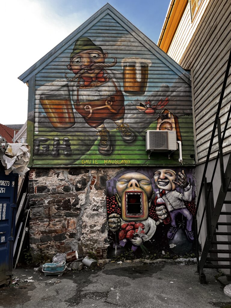 Von Stavanger nehmen wir die Fähre nach Bergen, der Hansestadt inmitten der Fjordlandschaften. Zum einen ist es eine entspannte und diesmal günstige Art zu reisen, zum anderen hat Simon ein Faible für Schiffsreisen entwickelt – was mich zum Nachdenken veranlasst. Voller Horror sehe ich uns im Alter cocktailschlürfend auf einem Kreuzfahrtschiff – ein Alptraum. In Bergen lassen wir uns Zeit, denn wir wissen noch nicht, wie es danach weitergeht. Bevor uns Flixbus unser Gepäck geklaut hat, war der Plan, über Oslo nach Stockholm und dann mit der Fähre nach Helsinki zu reisen. Dort wollten wir ein Workaway auf einem Demeter-Hof machen. Jetzt müssen wir in Norwegen ausharren. Bergen ist die zweitgrößte Stadt Norwegens und bevölkerungstechnisch etwa so groß wie Freiburg. Bryggen – früher Tyske Bryggen („Deutsche Brücke“) – ist das bekannteste Viertel der Stadt und heute UNESCO-Weltkulturerbe. Nach dem zweiten Weltkrieg hat man das Tyske rausgestrichen. In Bryggen hat die deutsche Hanse seit ca. 1340 rund 400 Jahre Handel getrieben. Das gesamte Viertel war von Deutschen friedlich besetzt, die zeitweise bis zu einem Viertel der Bevölkerung ausmachen konnten. Gehandelt wurde im Prinzip Stockfisch gegen Bier.