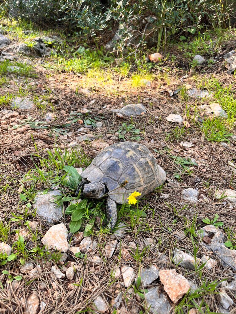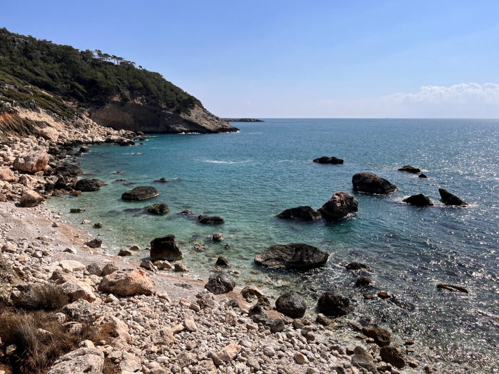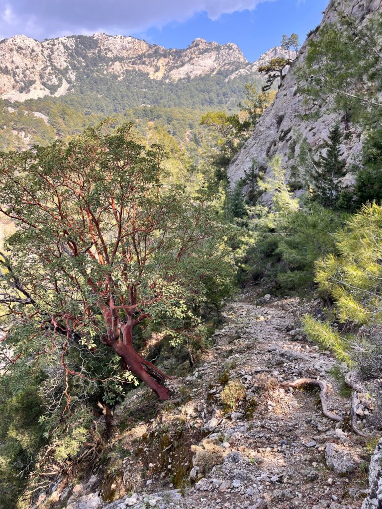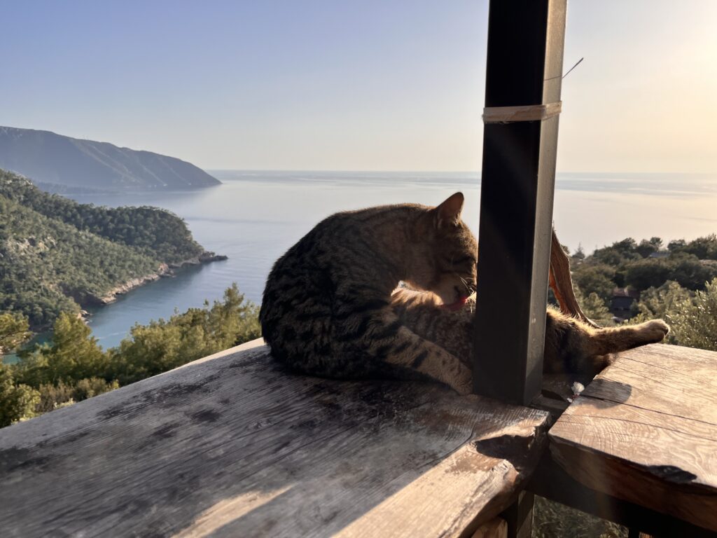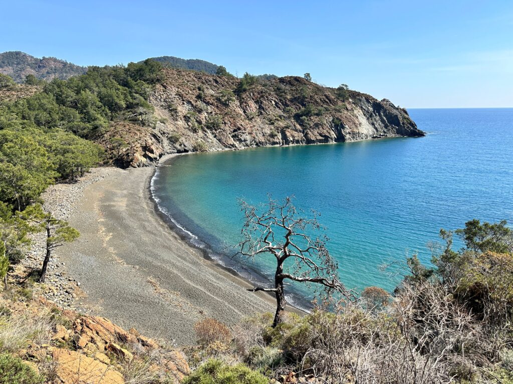 Von Ölüdeniz aus beginnt die erste offizielle Etappe des lykischen Wegs. Die nächsten drei Tage haben es in sich. Nicht unbedingt körperlich – die Wanderungen empfinden wir eher als mittelschwer – sondern vor allem landschaftlich. Wir wandern mit Blick auf die berühmte Bucht von Ölüdeniz, wo wir viele Paraglider bei ihrem Flug beobachten können. Aus ihren Lautsprechern klingen Songs von AnnenMayKantereit – die Almans sind also auch hier vertreten, sogar in der Luft. Wir wandern durch abwechslungsreiche Landschaften, besonders die Aussicht auf die Strände ist ein Traum, aber auch sonst ist alles schön anzusehen. Der Weg führt uns durch einen dschungelartigen Wald, vorbei an Wasserfällen, über felsige Hügel und Schotterpisten, durch ein Blumenmeer, vorbei an Ziegen, Schildkröten und – wo auch immer etwas zu Essen in der Nähe ist – Katzen. Auch dem einen oder anderen Hund begegnen wir, manchmal in Begleitung einer Herde von Schafen und Ziegen, manchmal auch einfach so. In den seltensten Fällen interessieren sie sich für uns, und wenn doch sind sie freundlich.